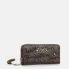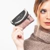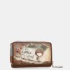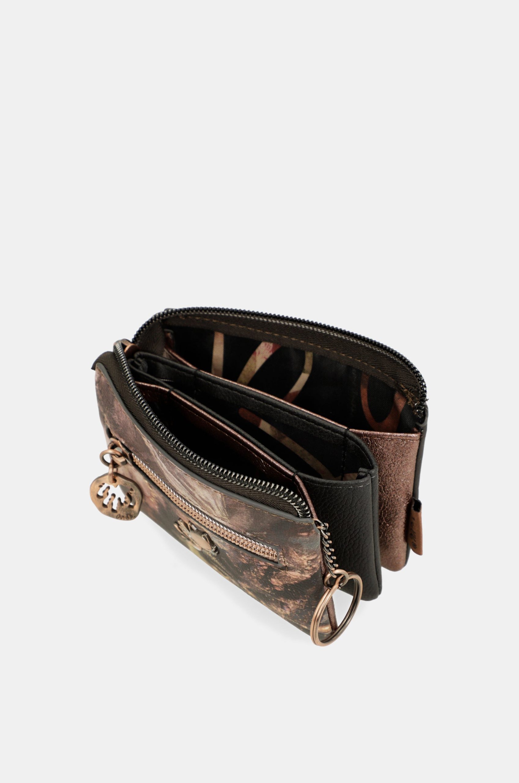 This small coin purse has a zip closure and three separate compartments inside its lined interior. It also has a back pocket.