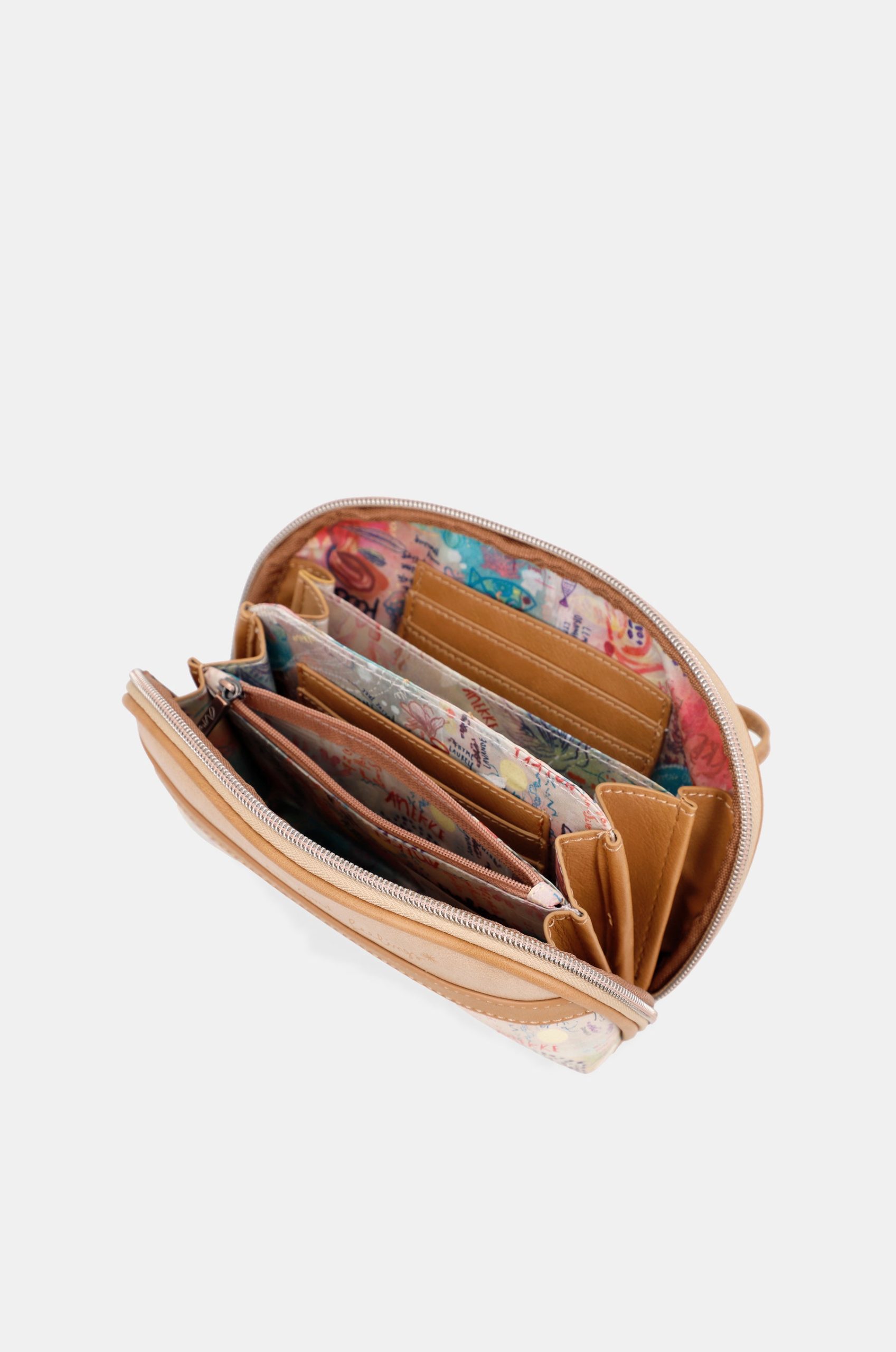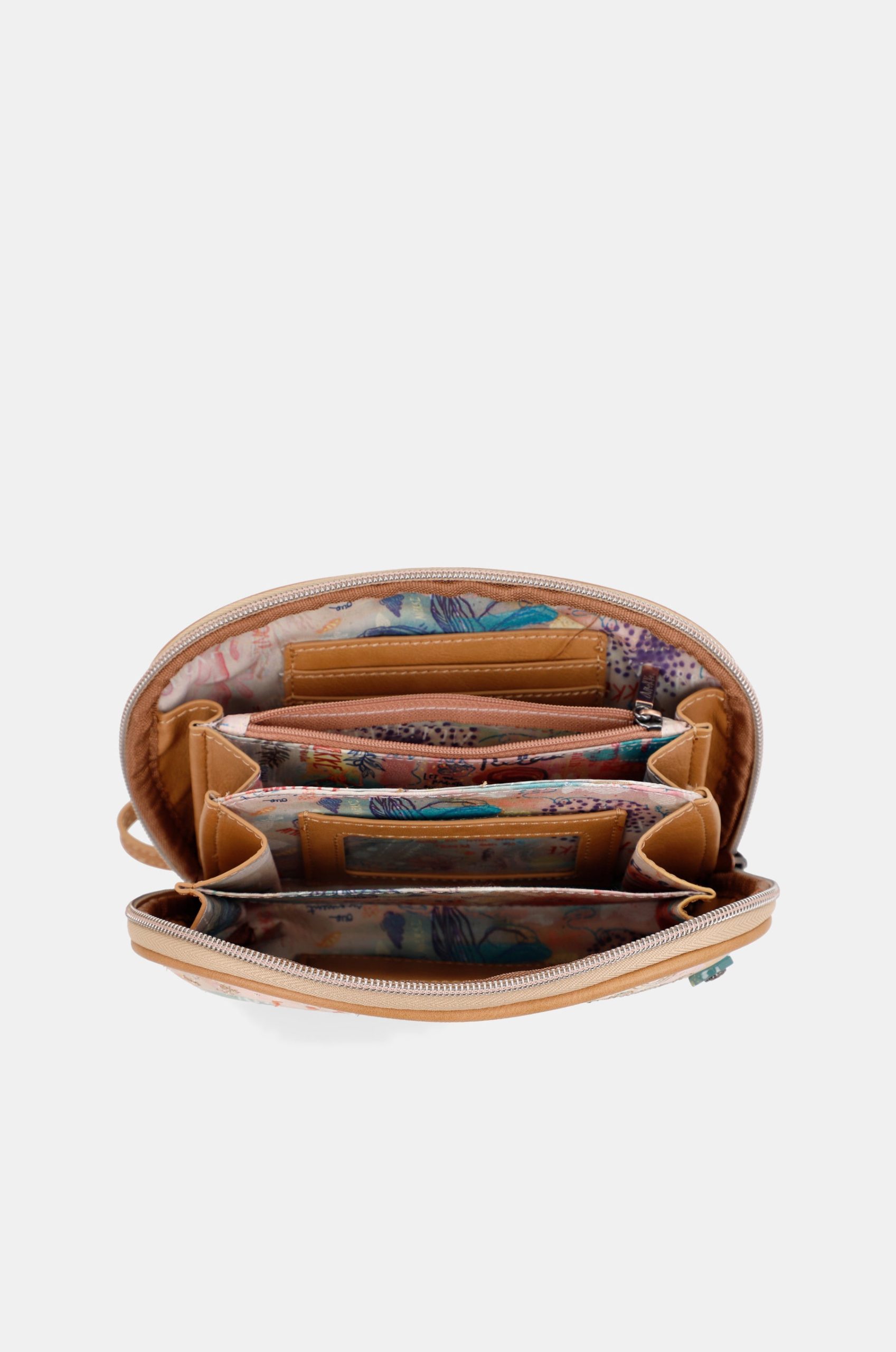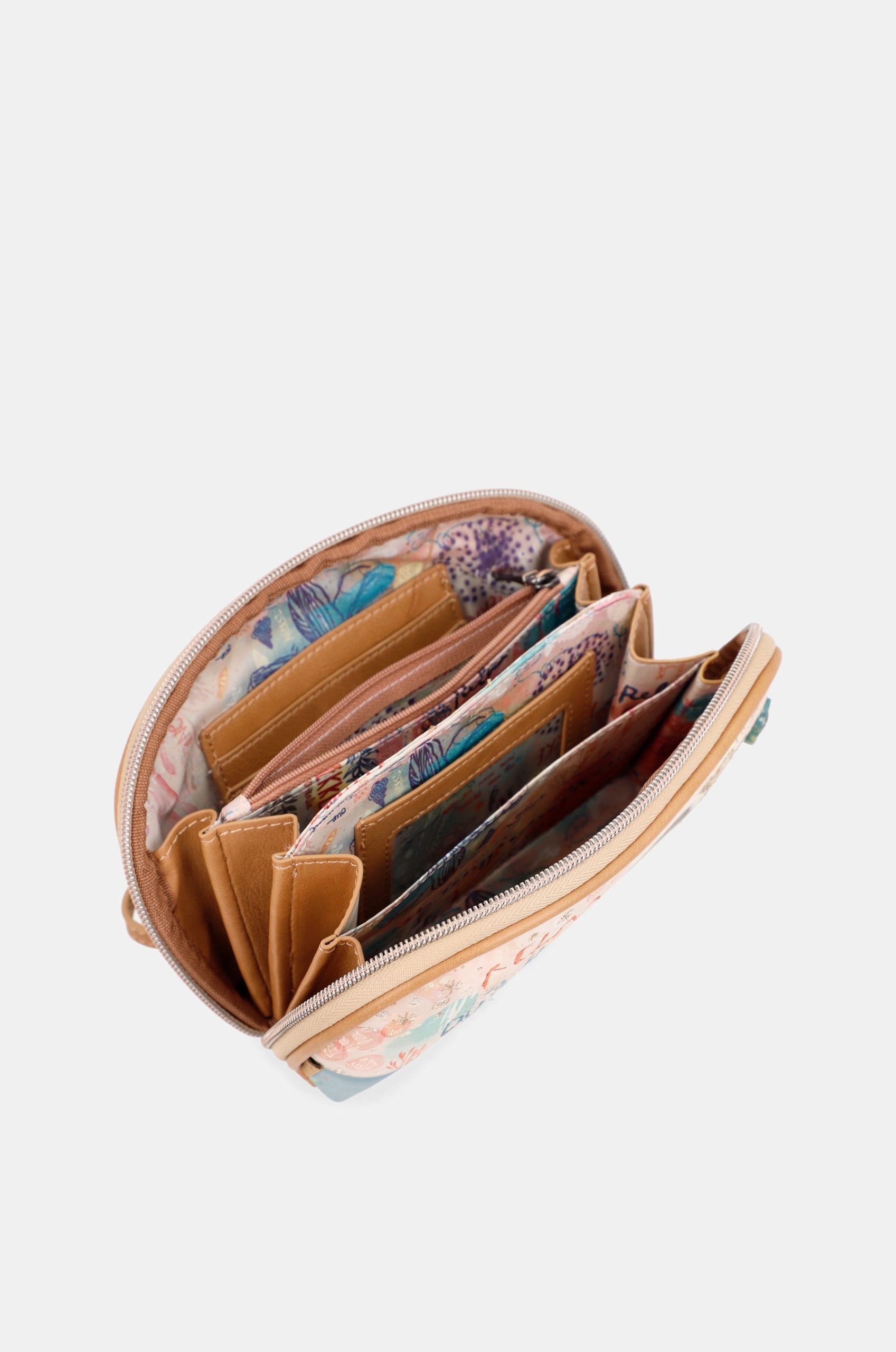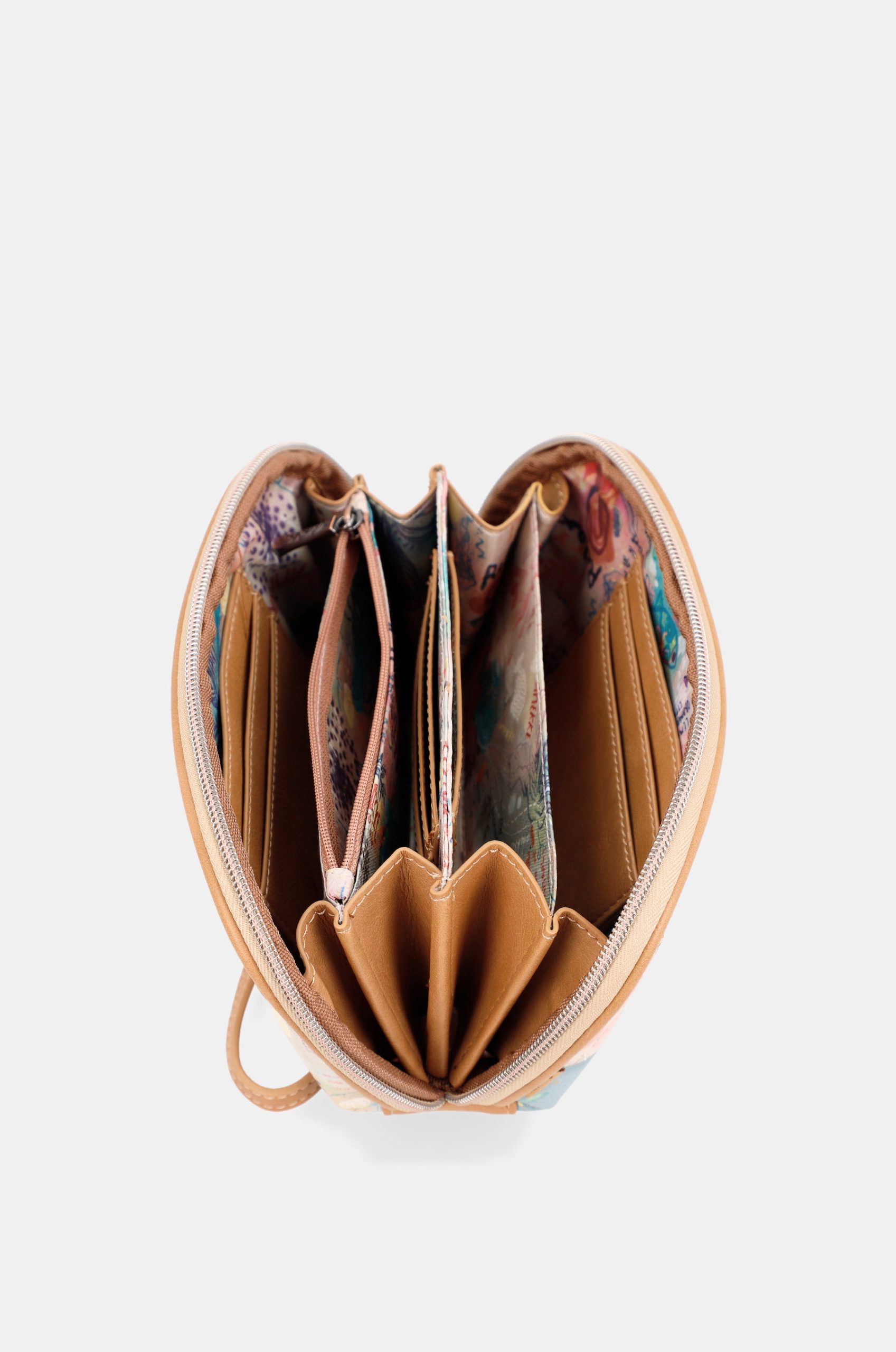 This original women’s wallet, which you can also use as a handbag, features a print on both sides. It is opened at the top by a zipper, where it houses a large lined interior with different dividers and a central pocket.