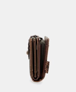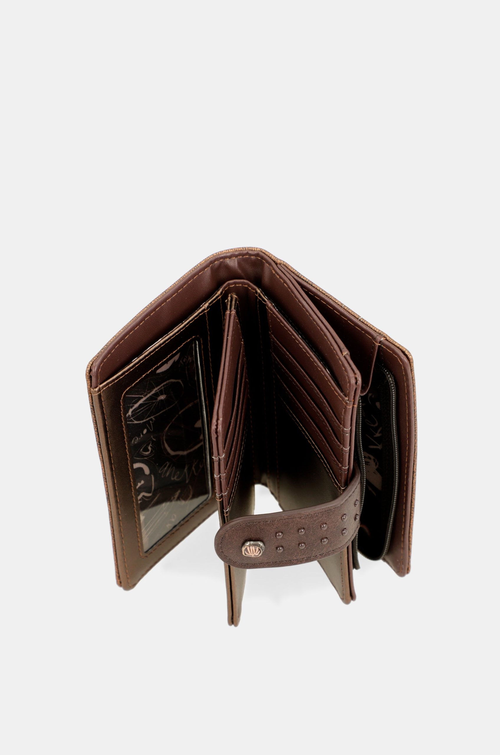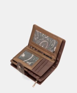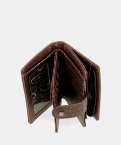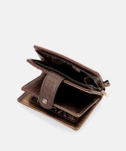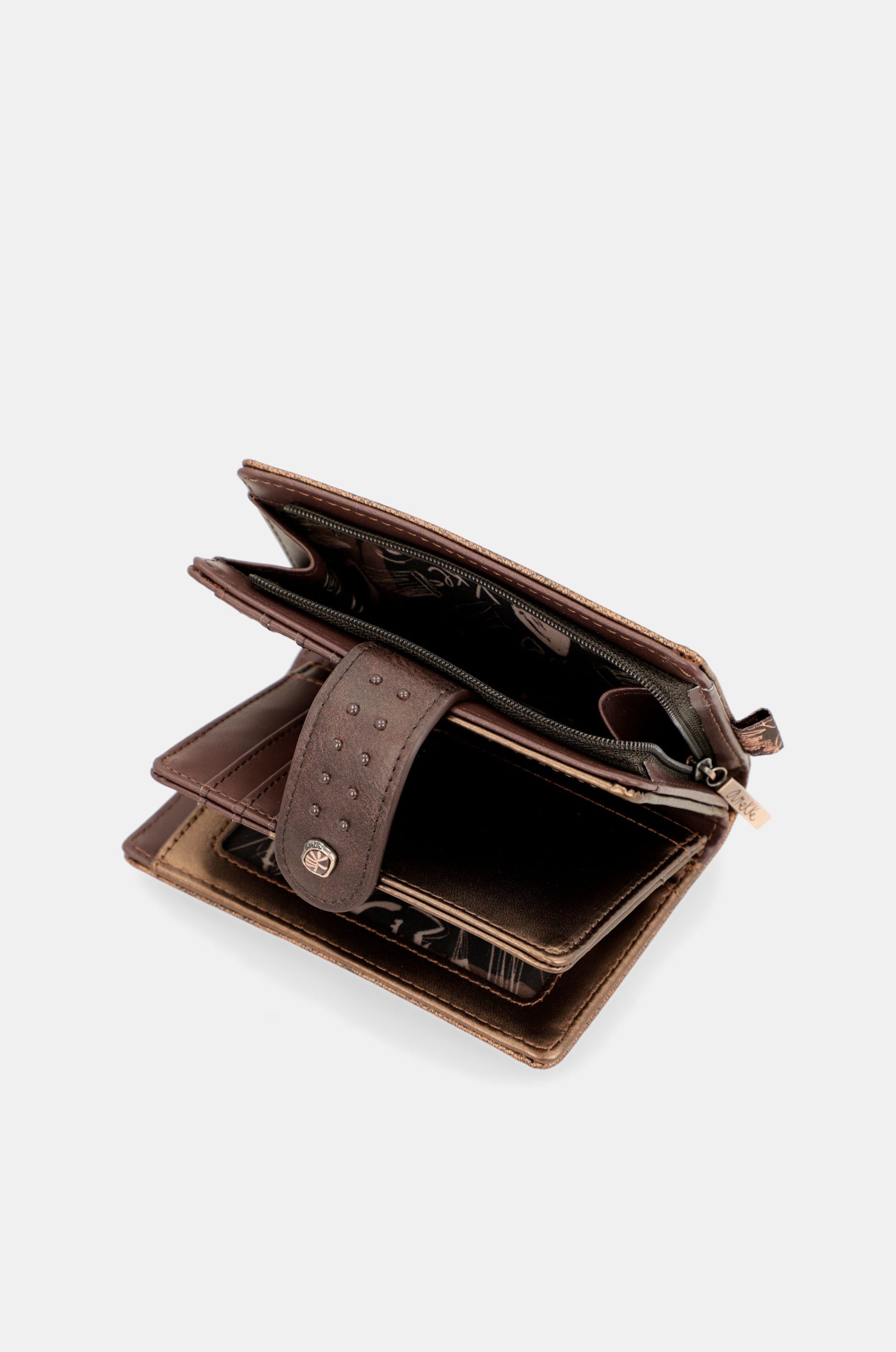 This medium sized brown wallet is made of flexible material and has two main compartments: the back, where you’ll find a large billfold and space for notes or documents. The top compartment has a zip, and inside you can store coins. The entire interior is lined.