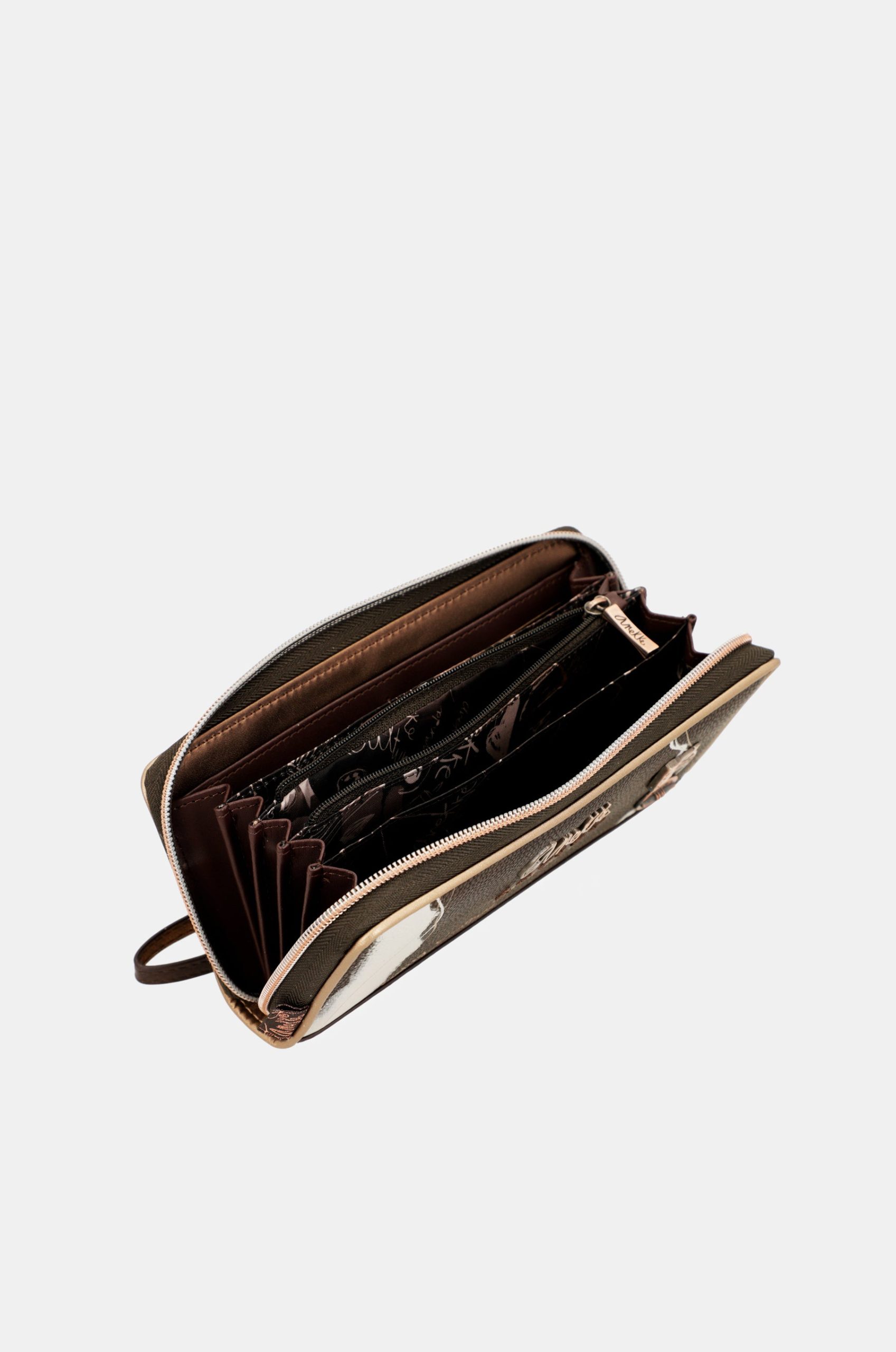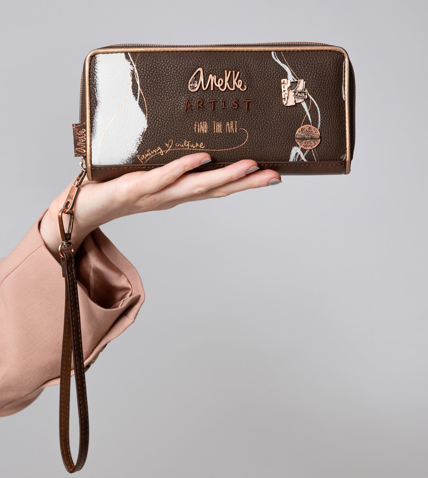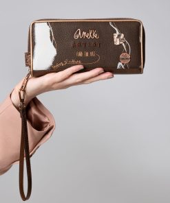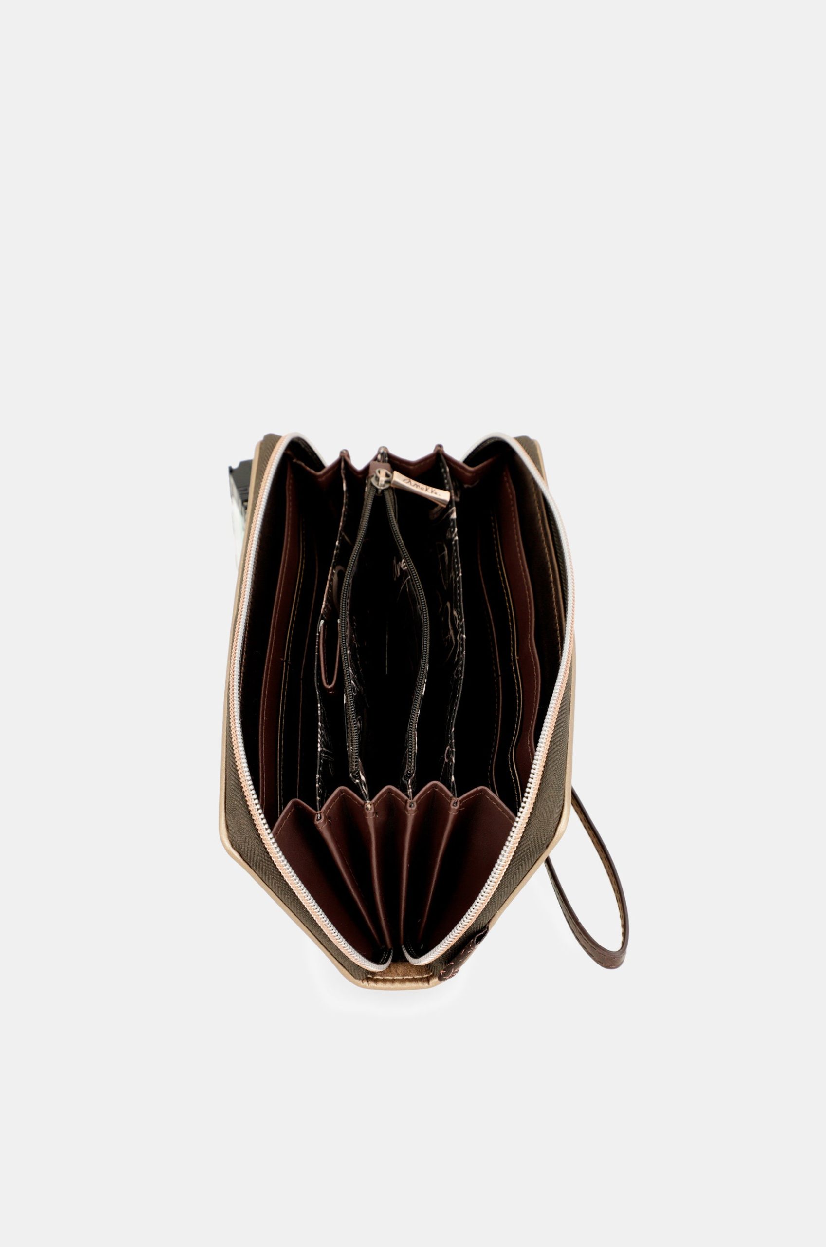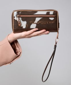 It’s a large brown wallet. You can also use it as a handbag. It is a very comfortable model that opens with a zip, has a lined interior and has a hand strap that is incorporated into the zip pull. Inside it has space for cards, banknotes and a zipped compartment for coins for greater convenience.