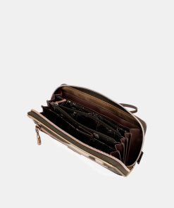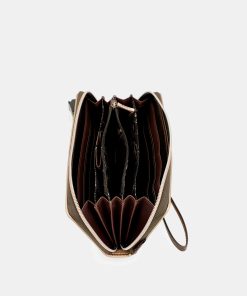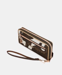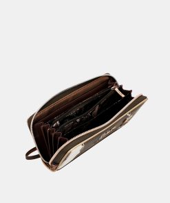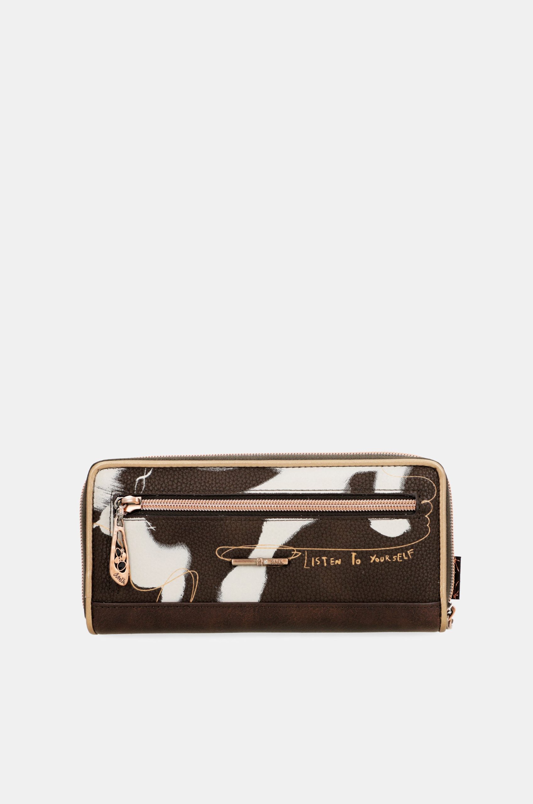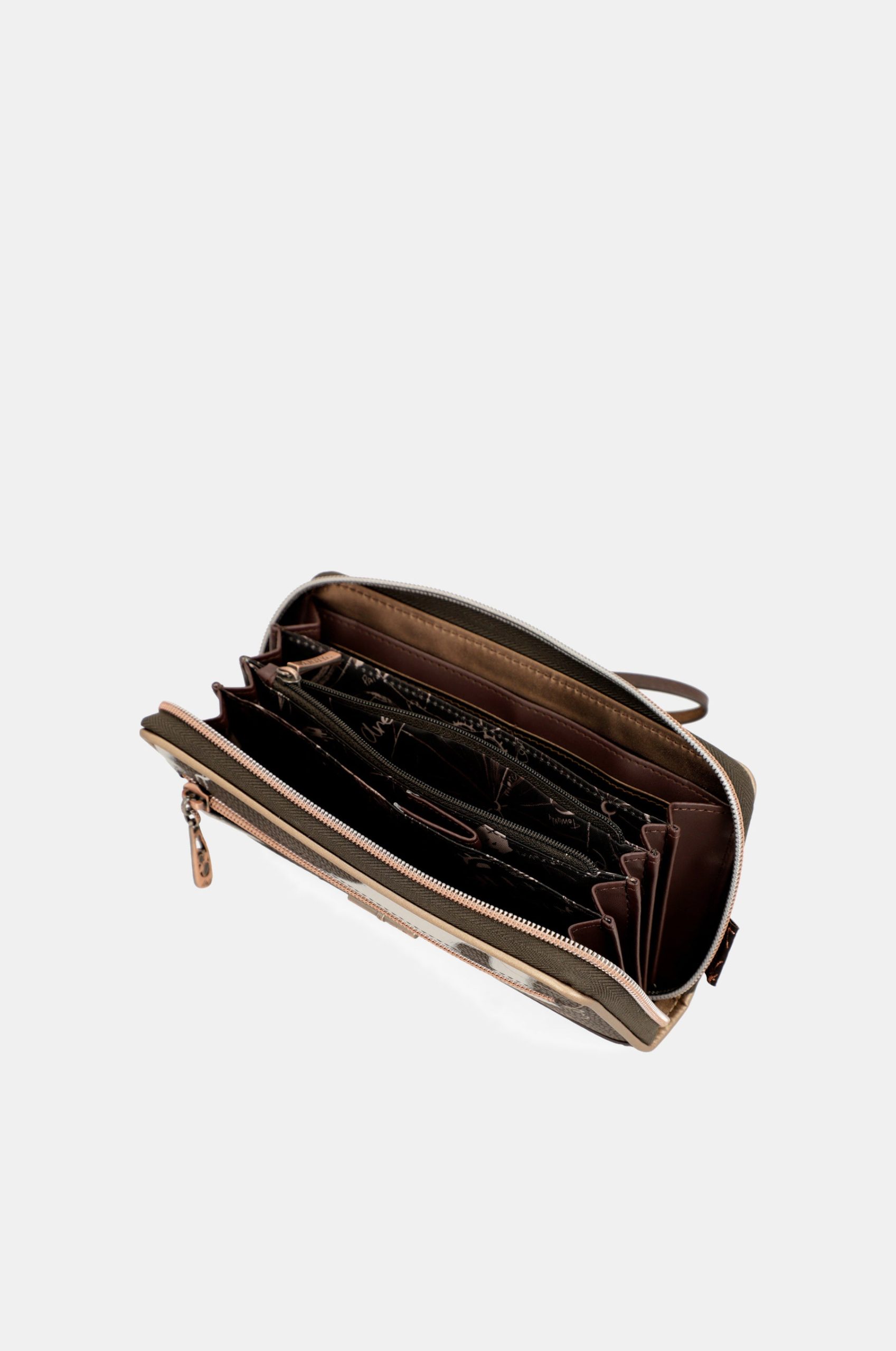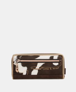 It’s a large brown wallet. You can also use it as a handbag. It is a very comfortable model that opens with a zip, has a lined interior and has a hand strap that is incorporated into the zip pull. Inside it has space for cards, banknotes and a zipped compartment for coins for greater convenience.
