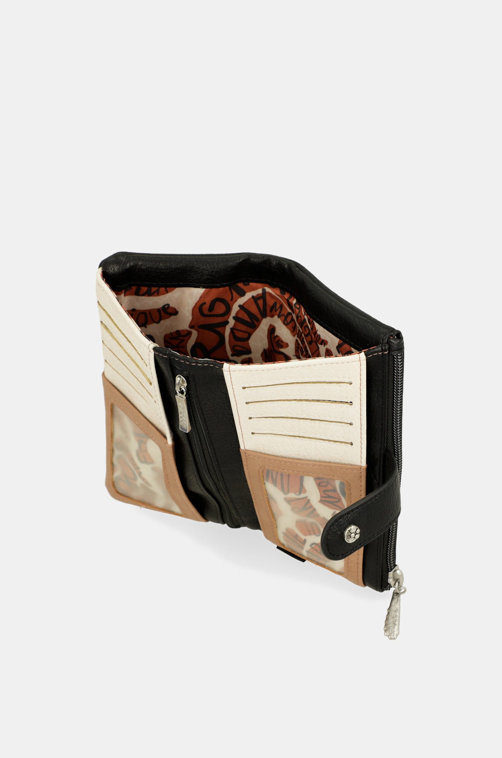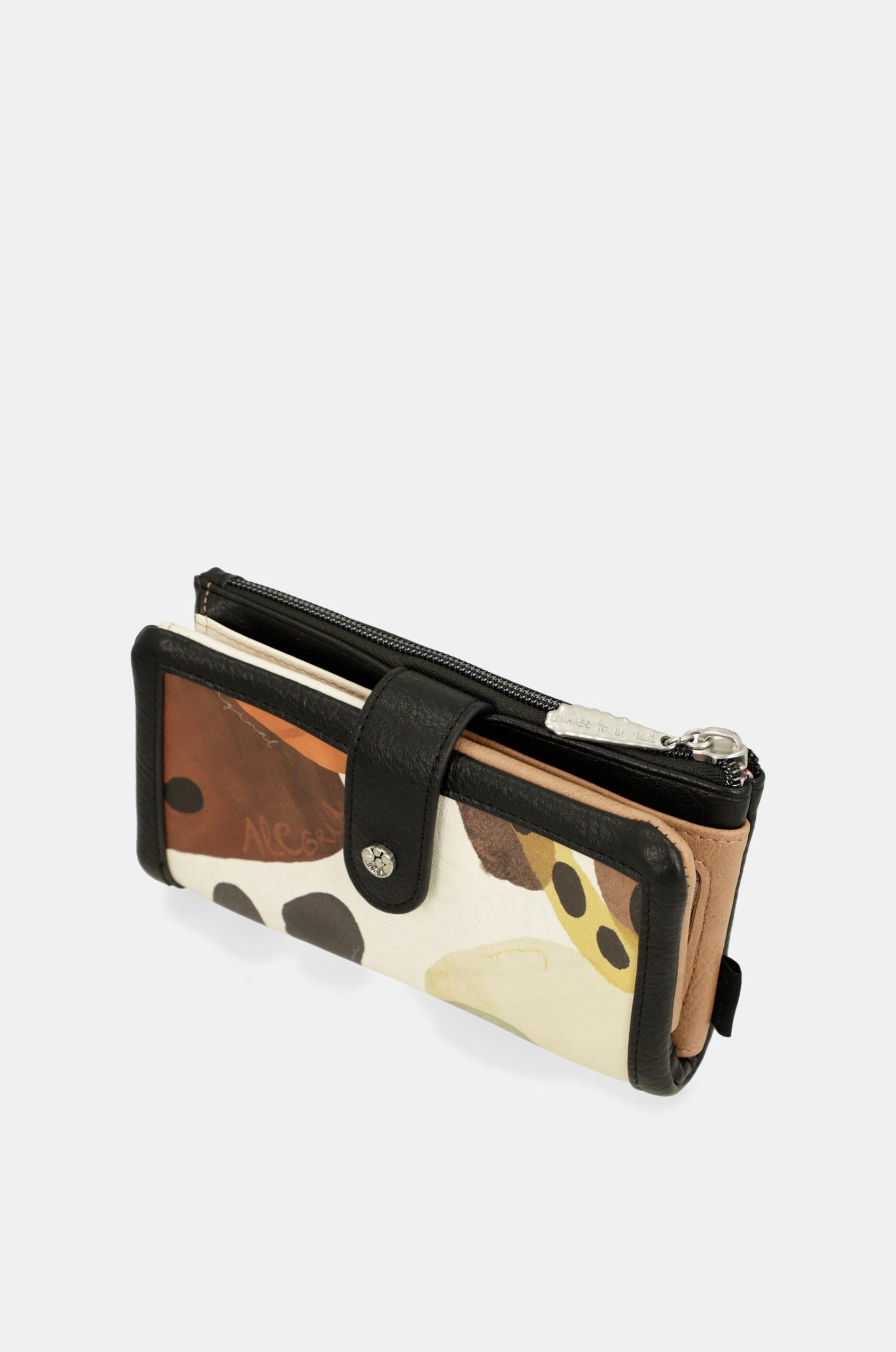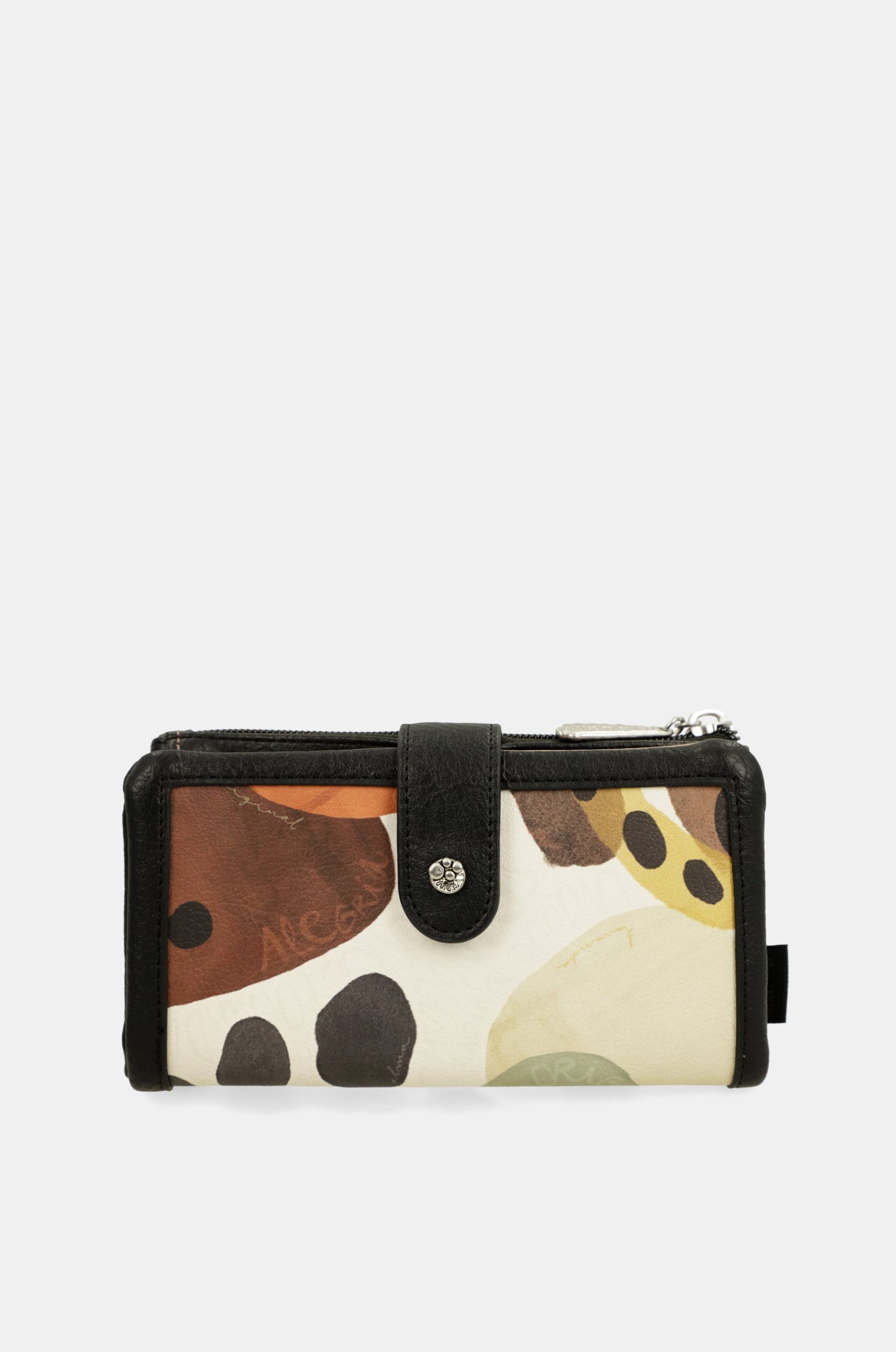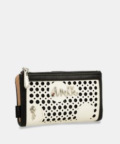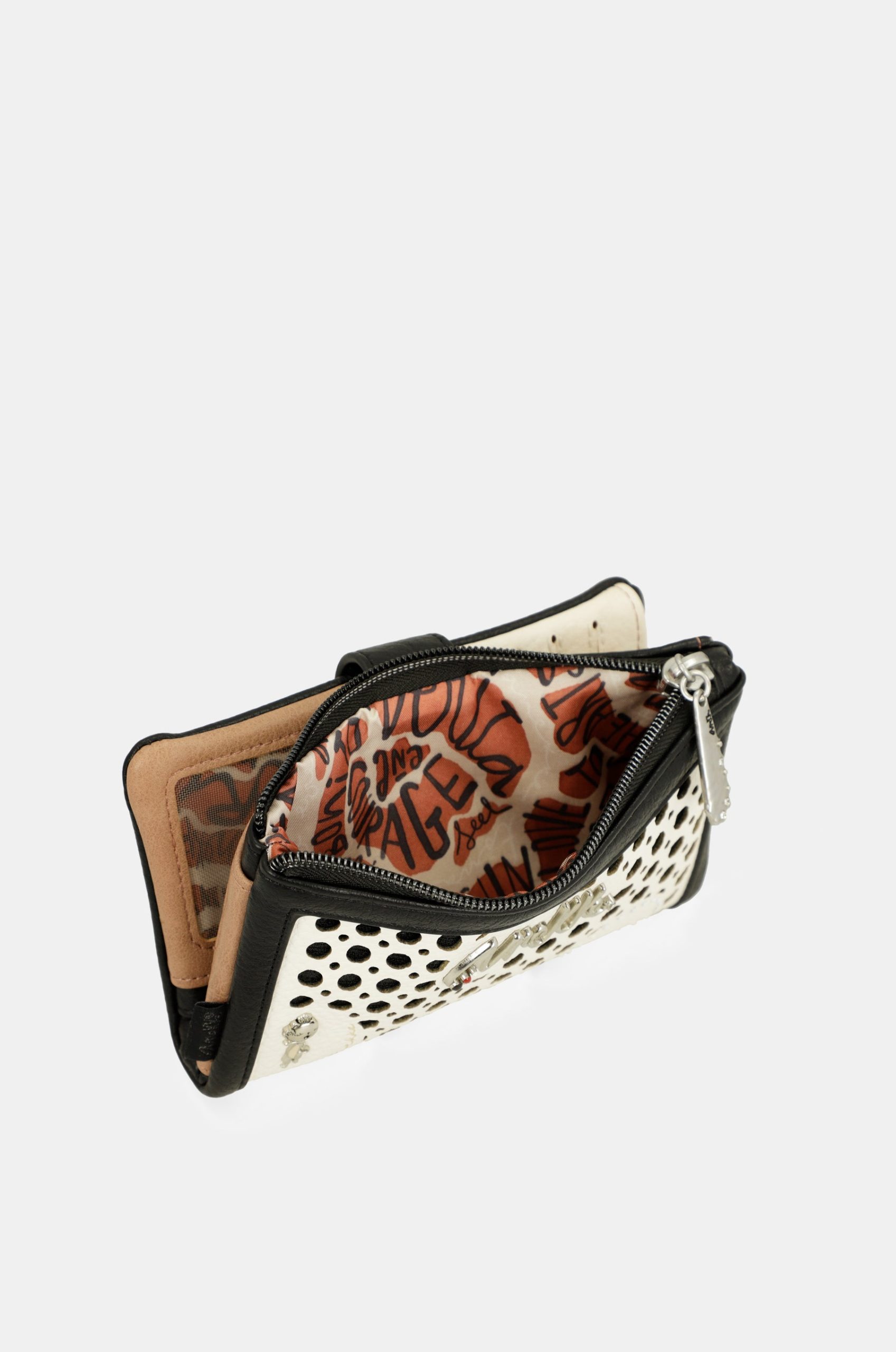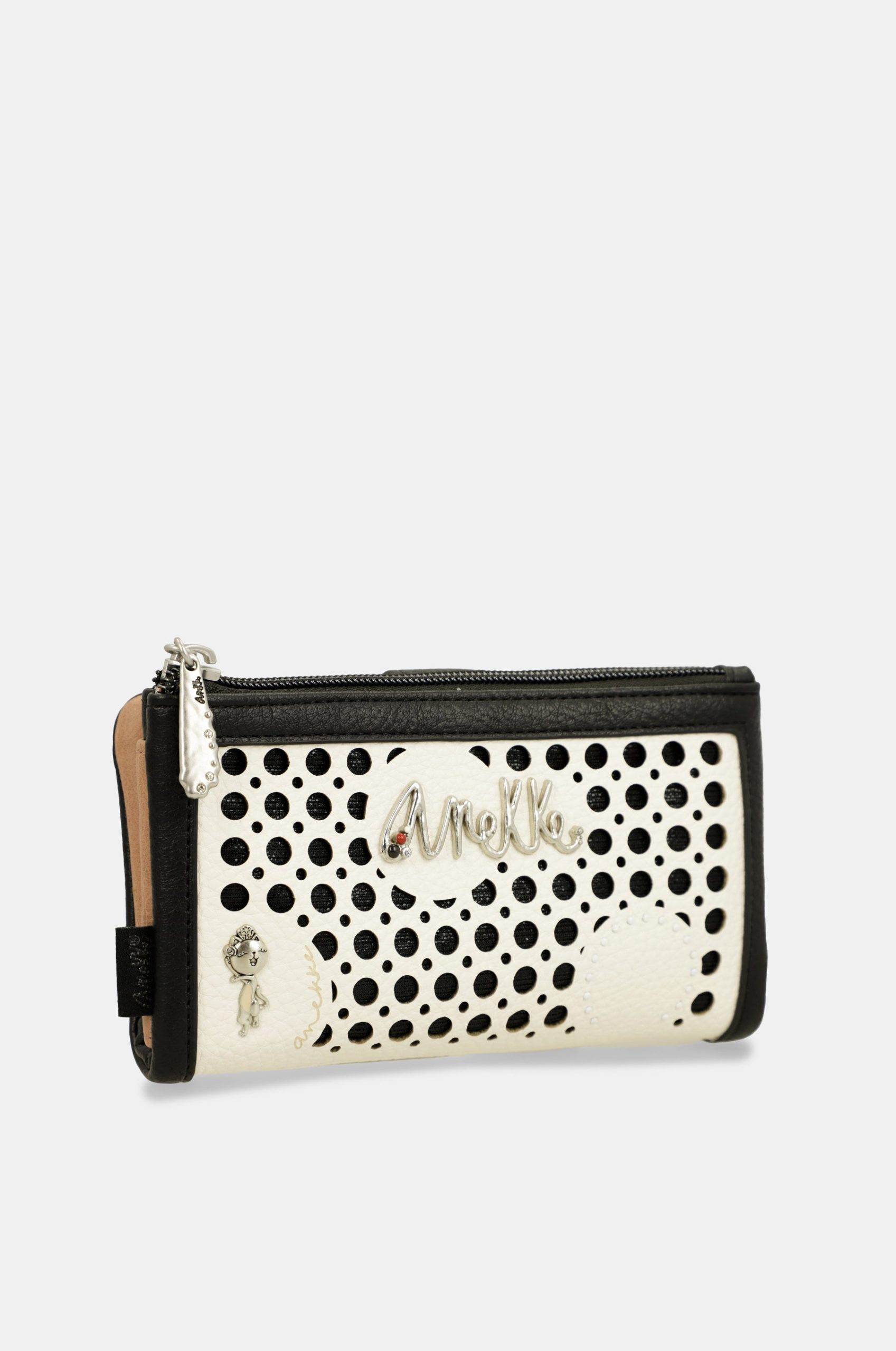 This product is part of the Lunares line. These original circles represent one of the traditional motifs of Spanish culture, recreated in the form of an artisanal wicker grid overlaid with larger, geometric polka dots. In this line, you’ll find very chic formats with a reimagined traditional touch, through the many details on rivets, cutouts, and pins. It is a large-sized wallet. It is made of flexible material. It has two main compartments: the back, where you will find a large billfold and space for banknotes or documents. It has a zip at the top, and inside you can keep coins. The entire interior is lined. And although they say the soul is something you cannot see or touch, doing something “with soul” means doing it with love, excitement, and your best self. So get ready to dance with soul with Anekke, and choose your new favorite now!