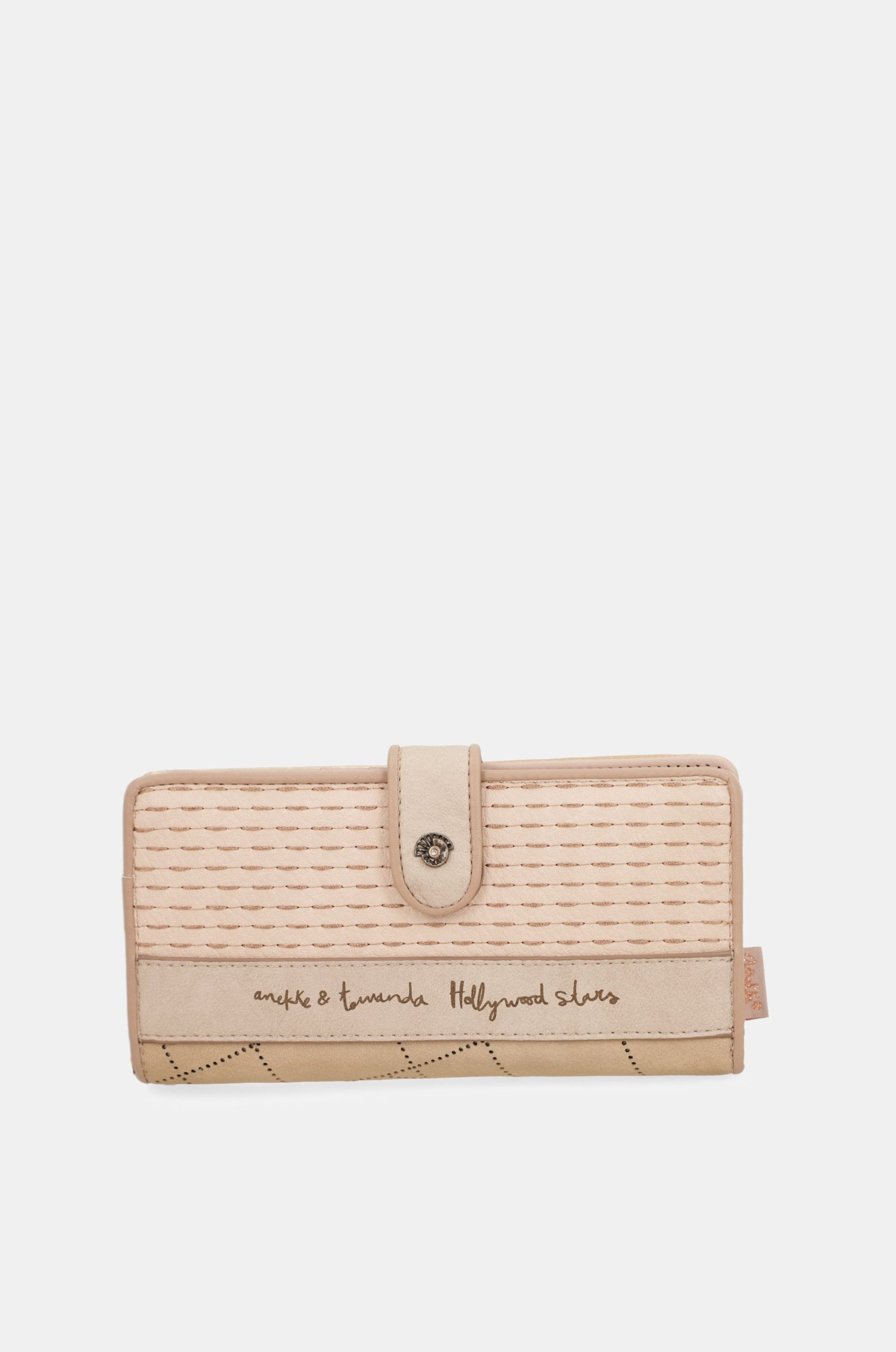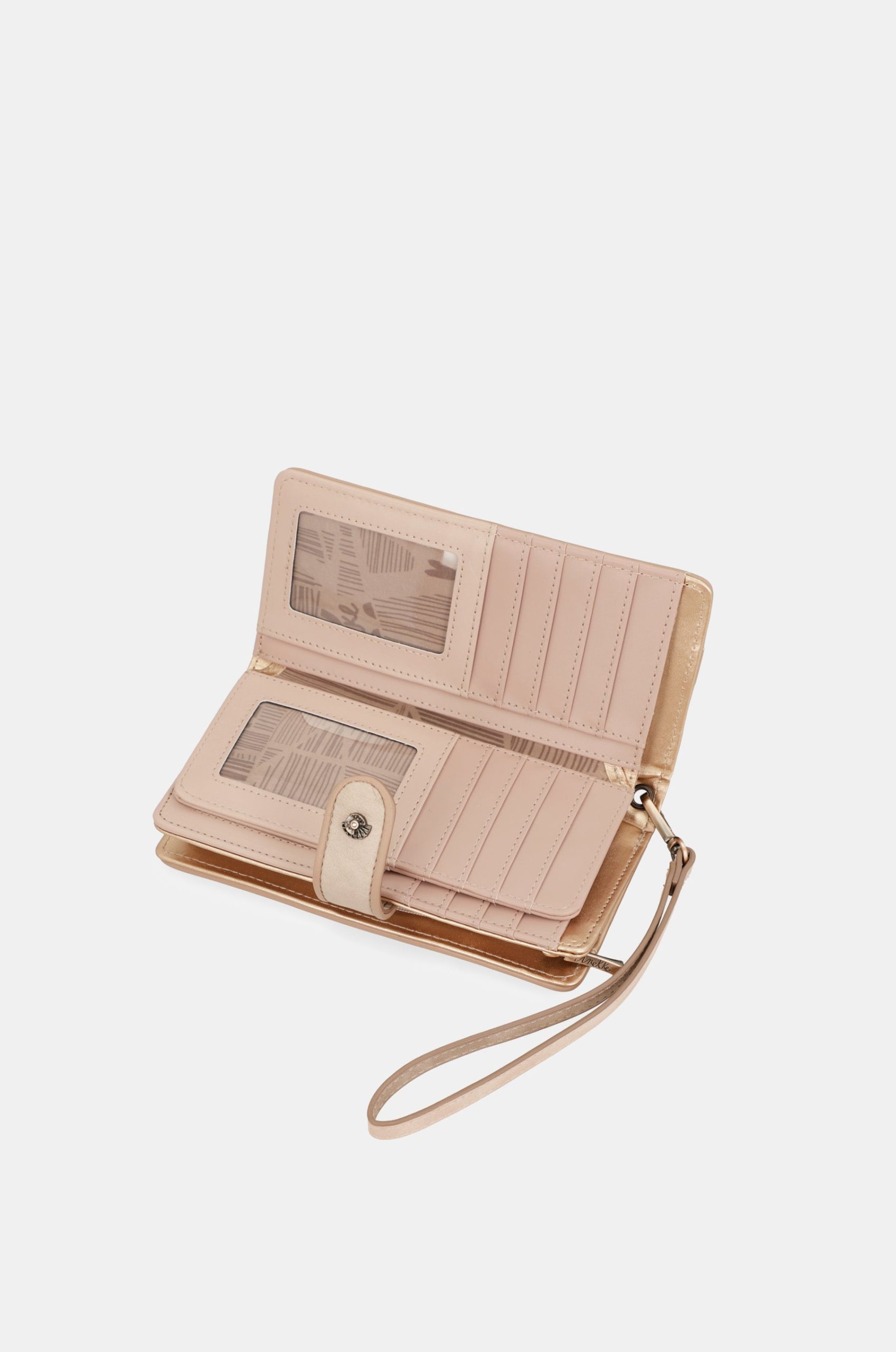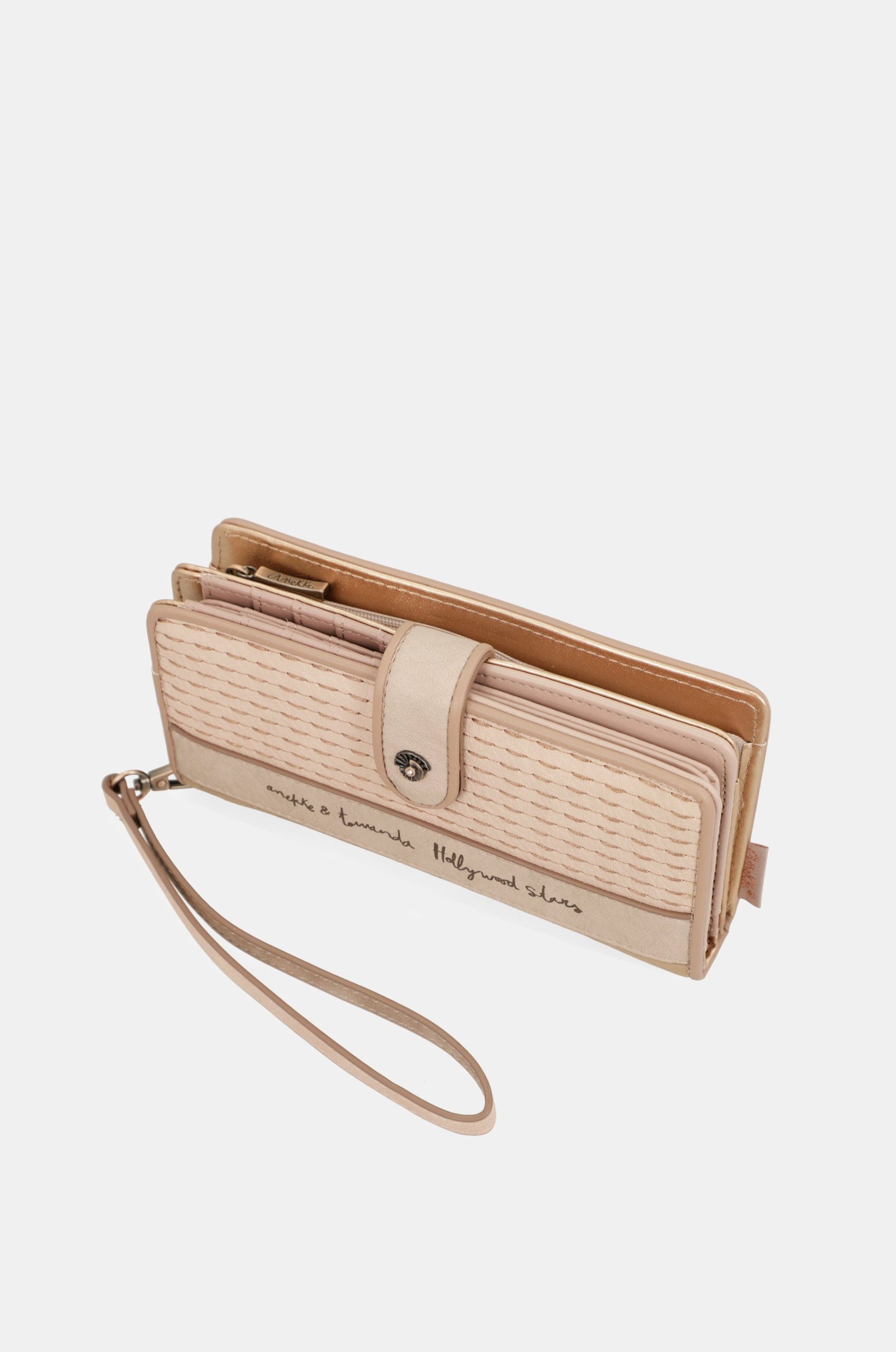 This large-sized wallet has two main compartments: the back, where there is a large billfold and space for banknotes, cards or documents, and the top with a zip closure to keep coins inside. The entire interior is lined. In addition, it has a hand handle for easy carrying.
