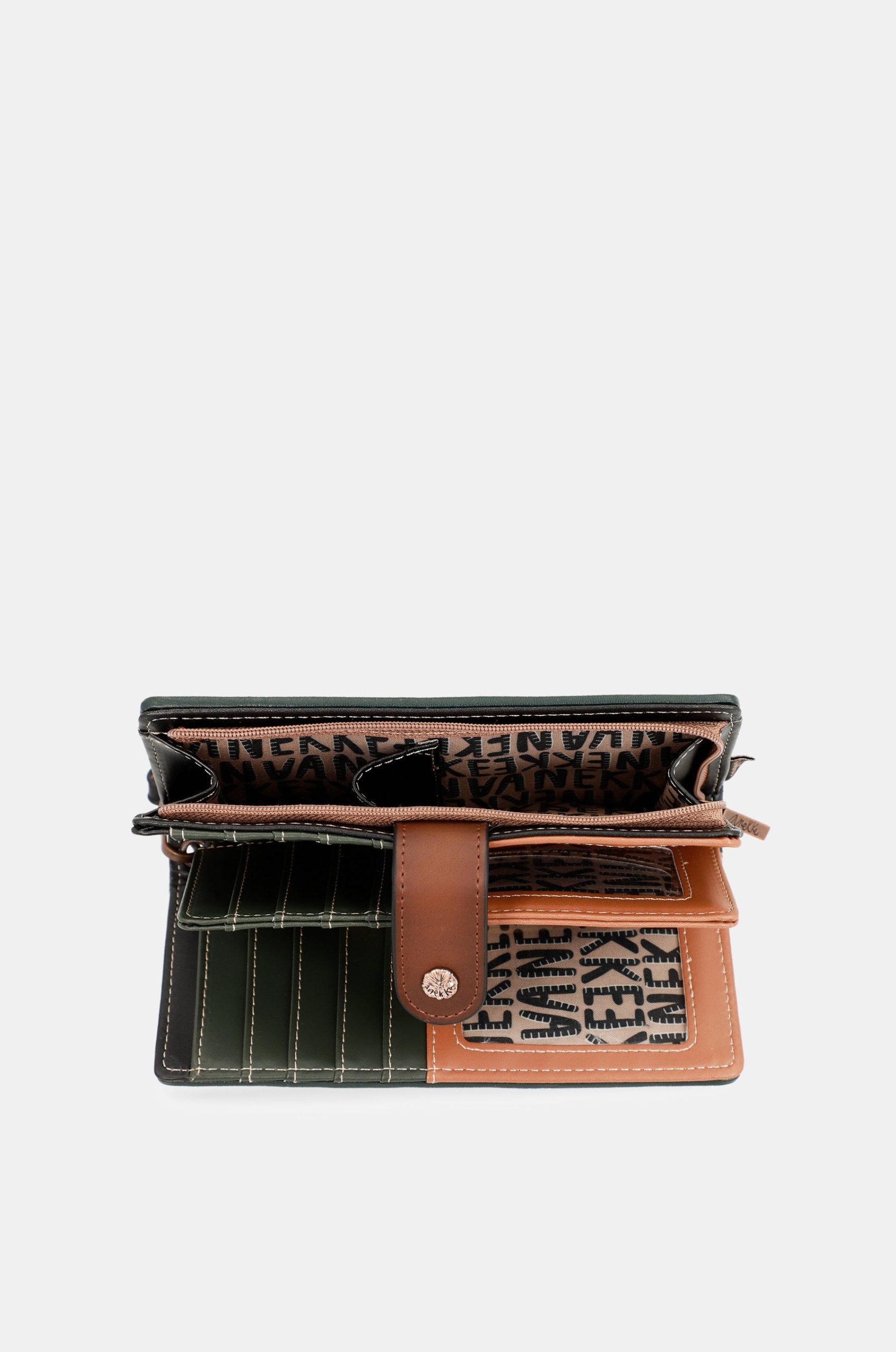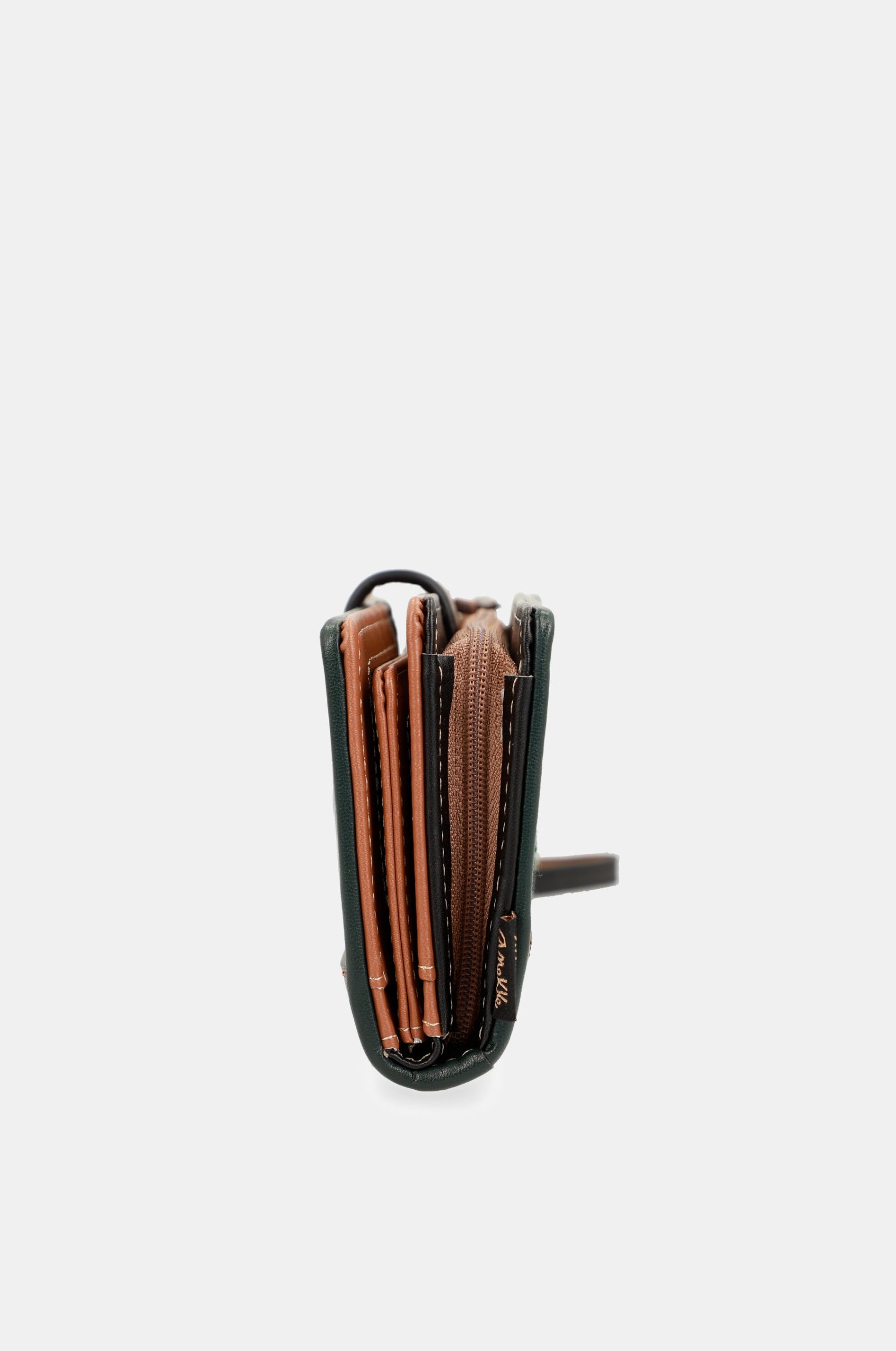 It has two main compartments: the back, where you will find a large wallet and space for bills or documents. The upper part has a zipper, and inside you can store coins. The entire interior is lined.