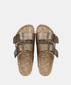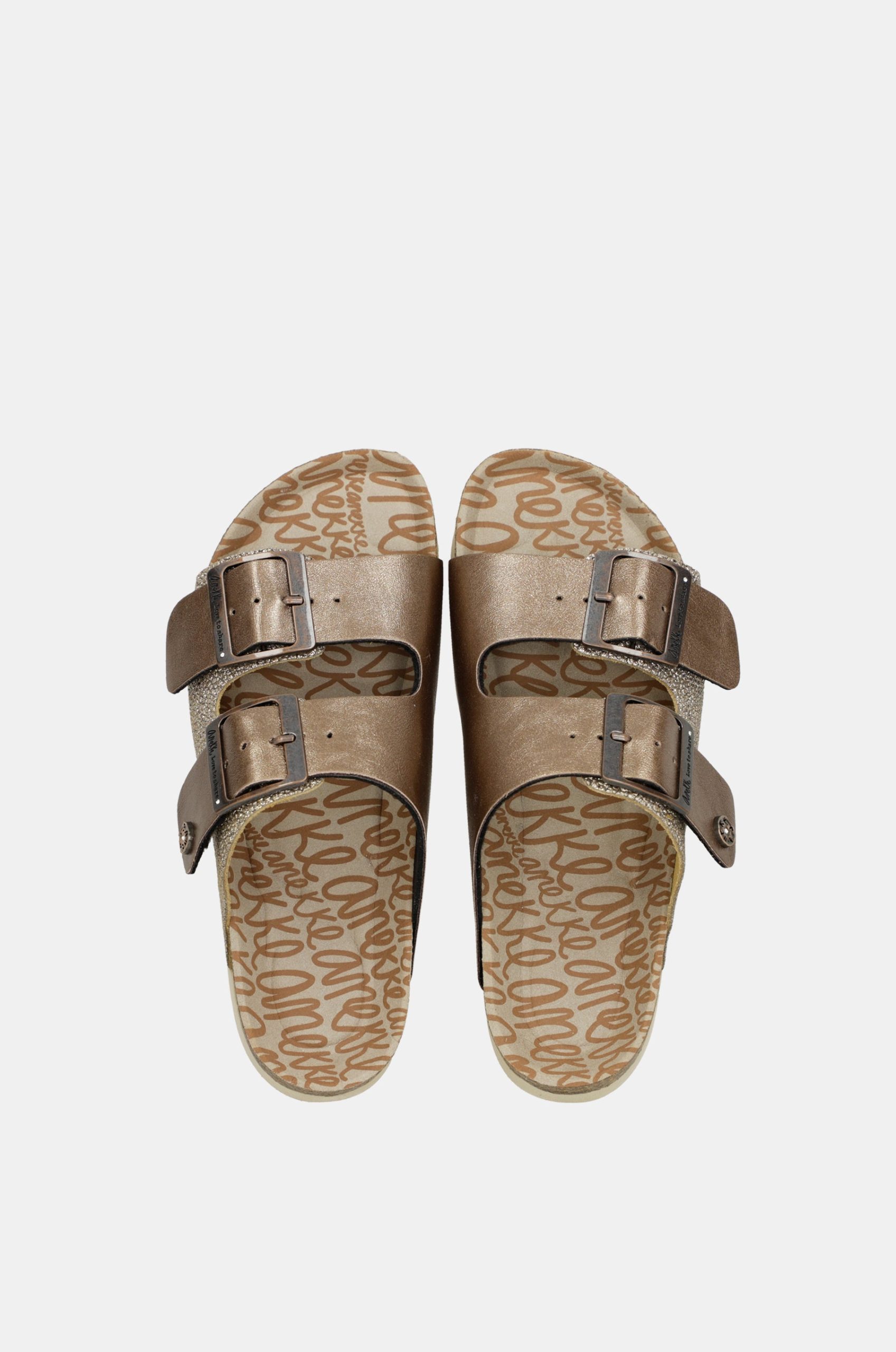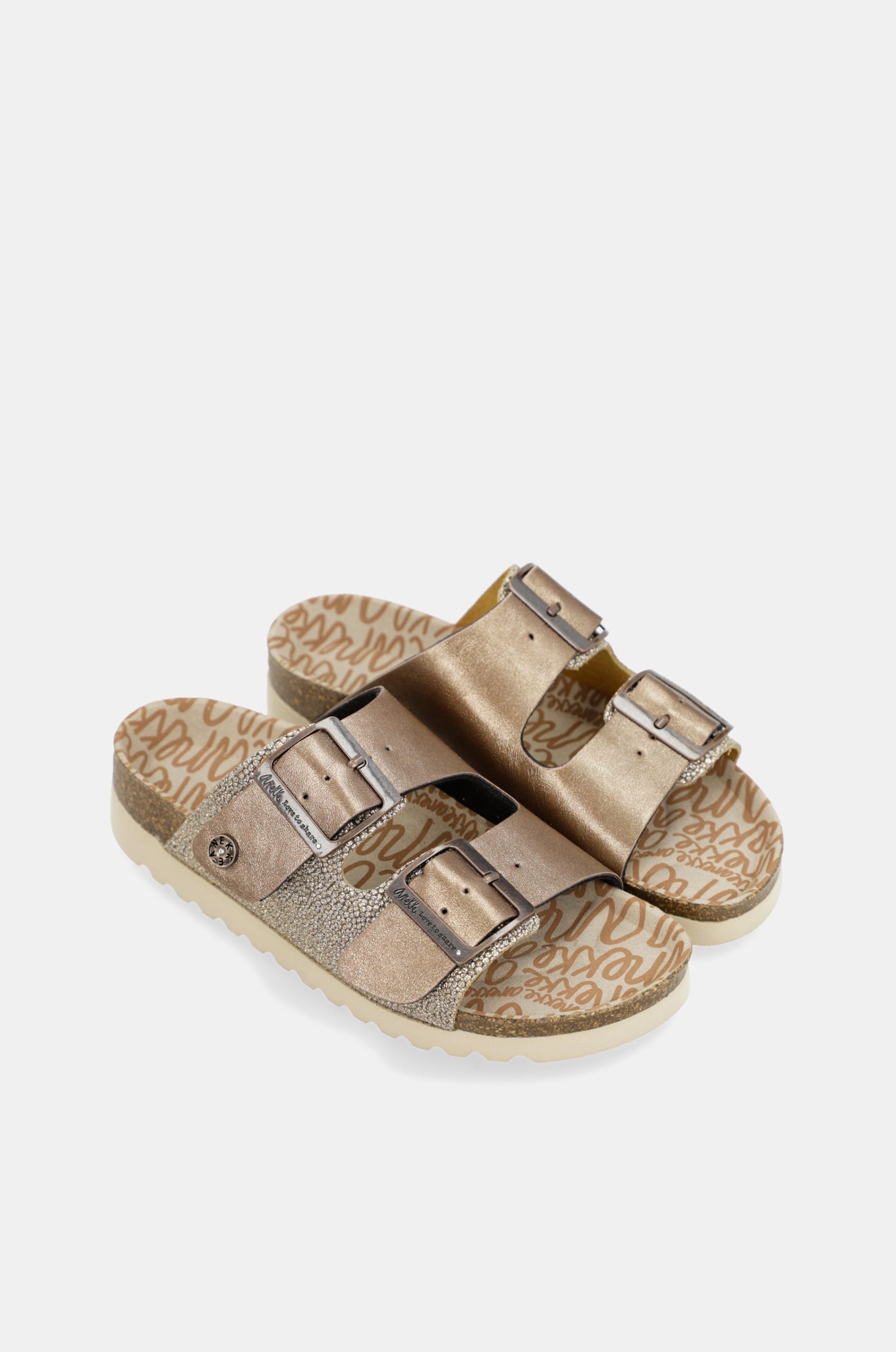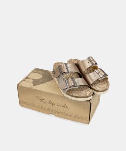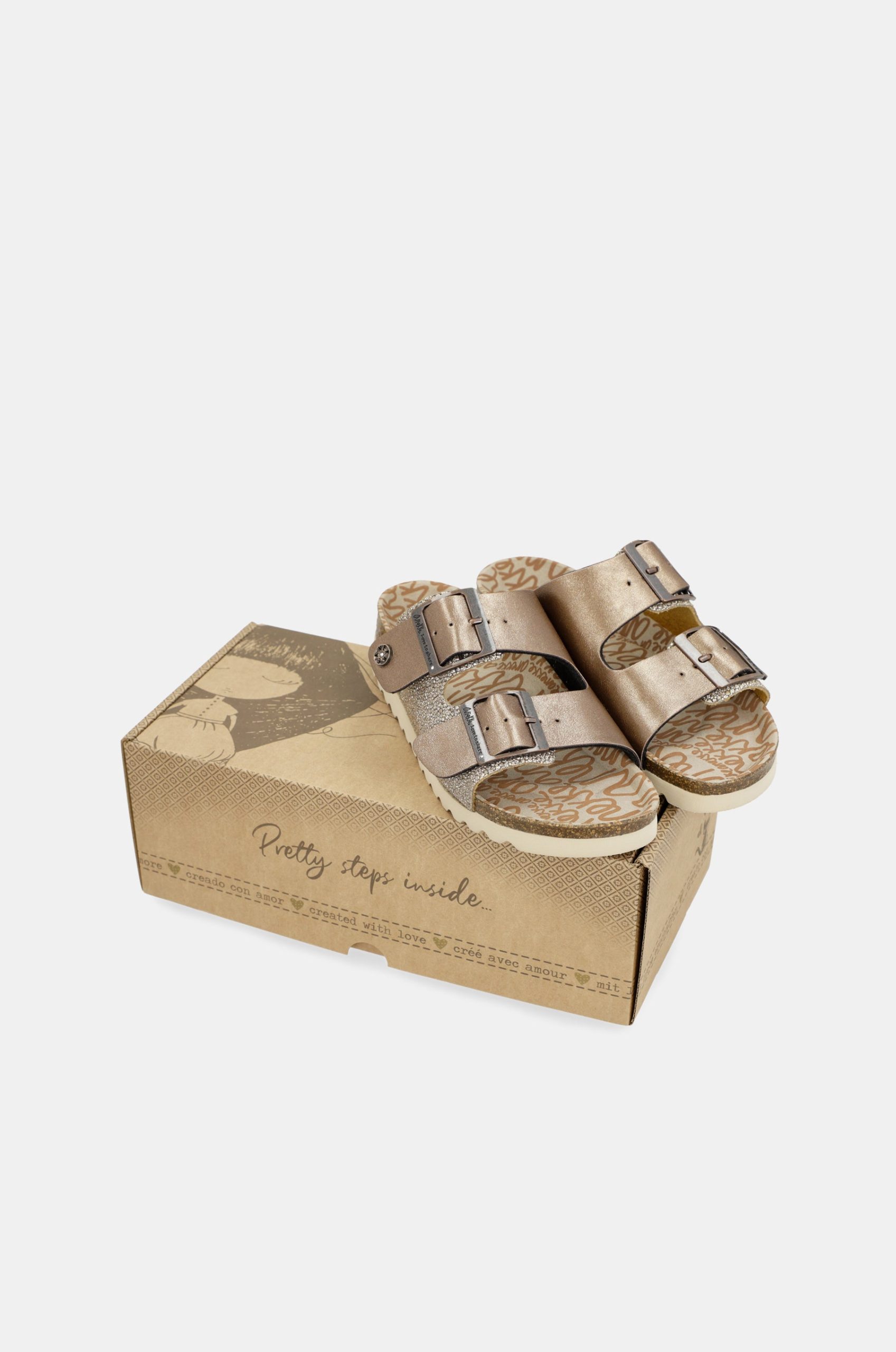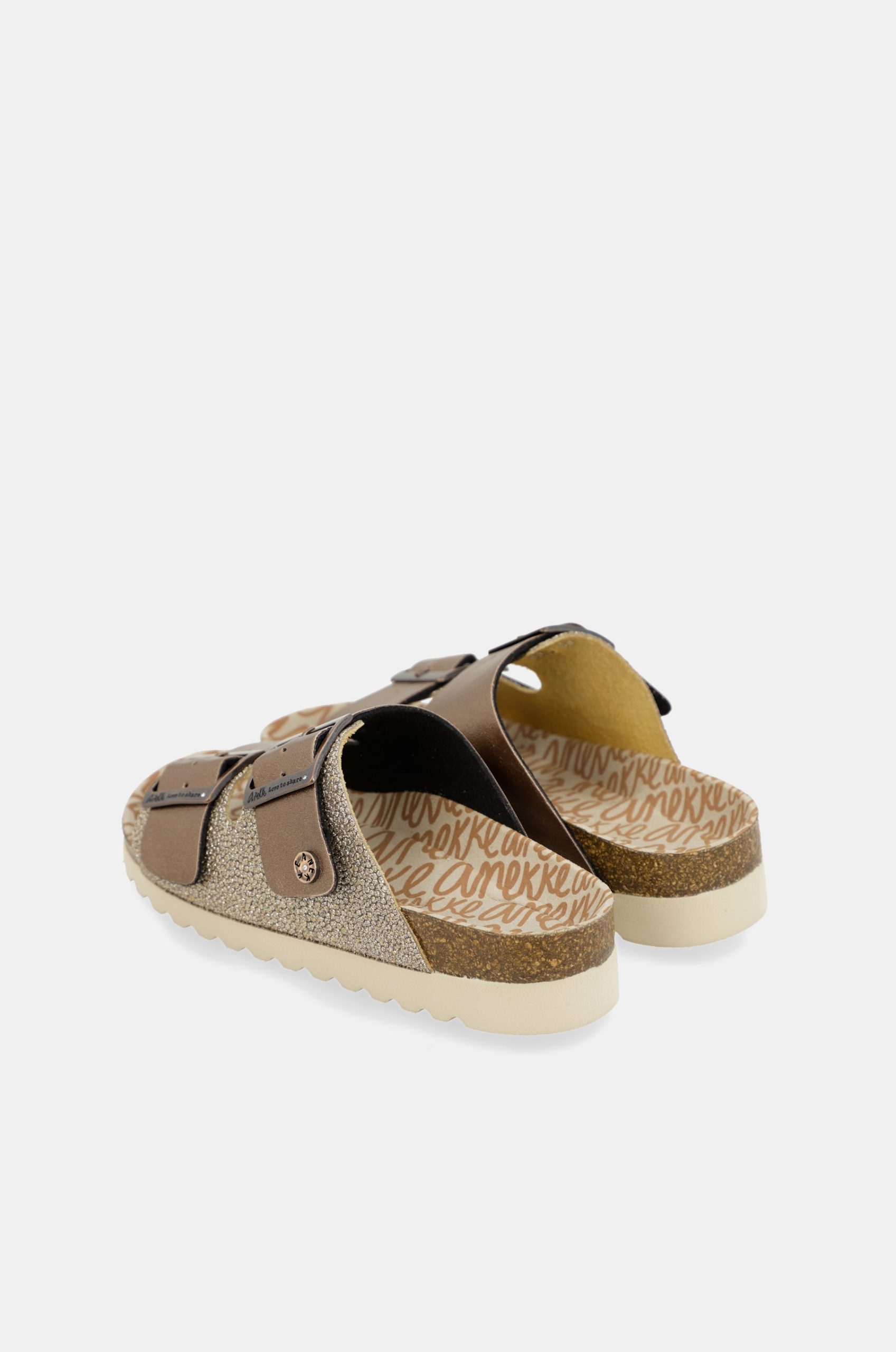 These bronze-coloured bio sandals are like a hug for your feet, bringing comfort and style together. Its natural cork base and the combination of materials in a bronze tone with a glitter base, plus the printed insole and the 100% personalised details, result in a unique pair of bio sandals. The buckles ensure they fit different feet, making them the most comfortable sandals in the world. Quality and design can go straightaway to your feet, get yours now!