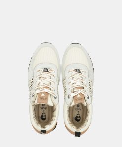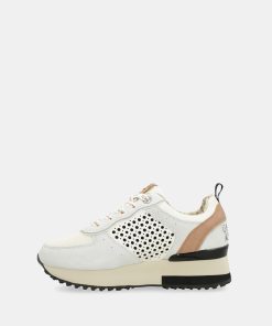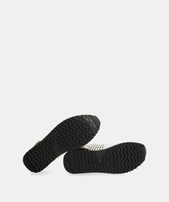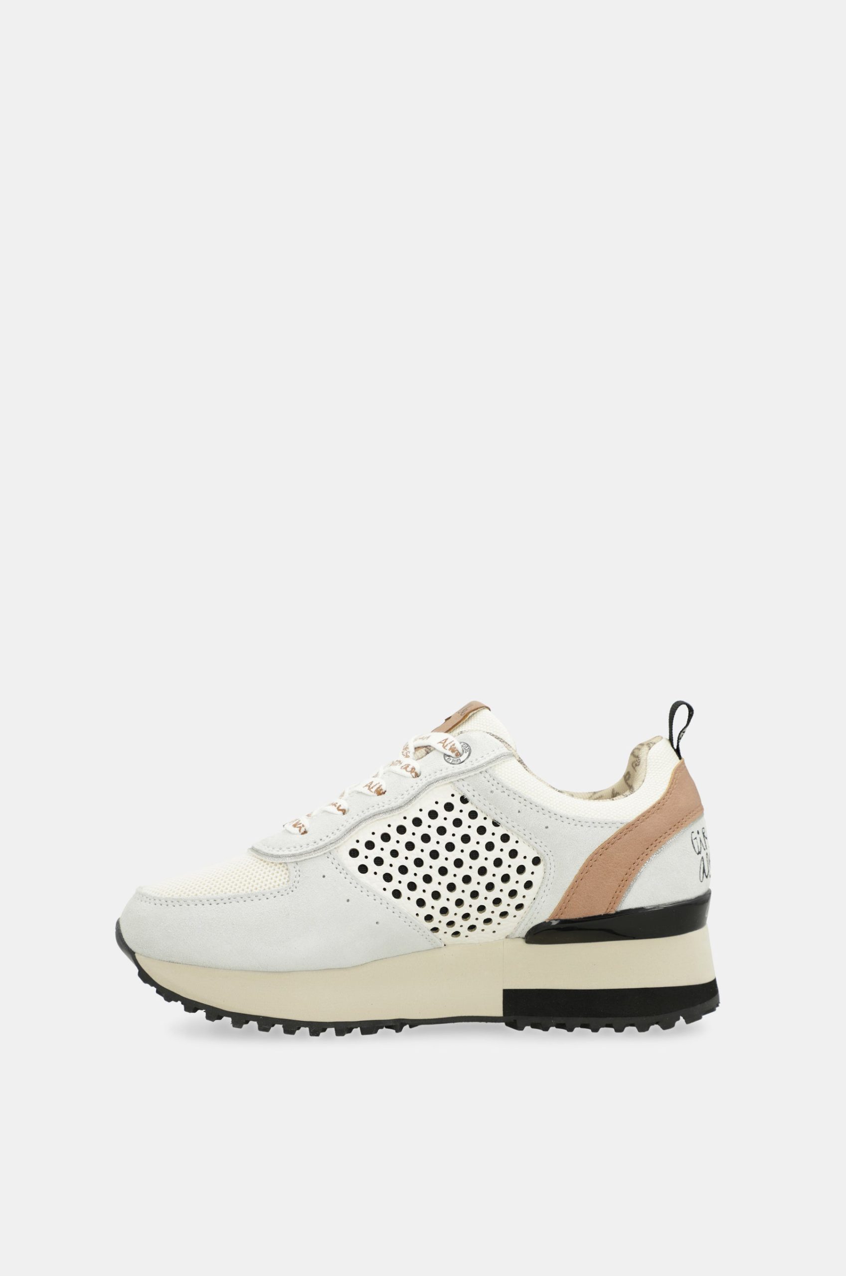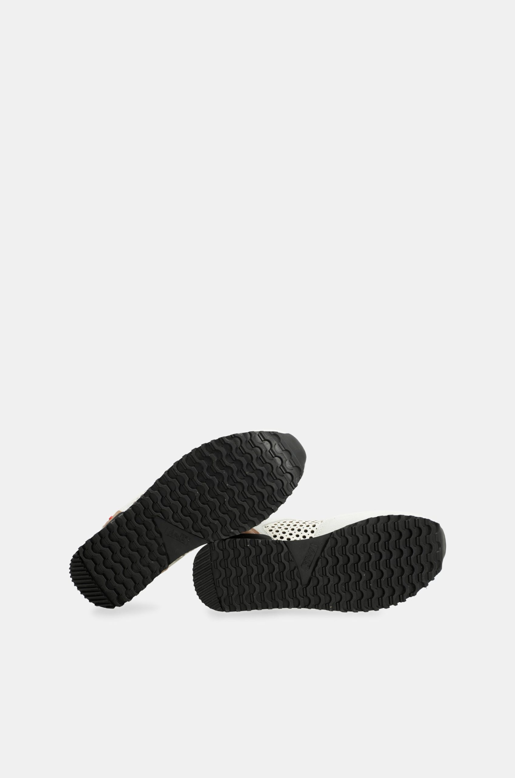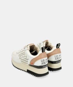 Their original design combines a gray base and features a bicolor sole in white and black. They have a platform cleated sole and cushioning in the heel area for comfortable and secure stepping.