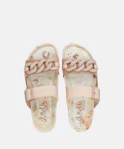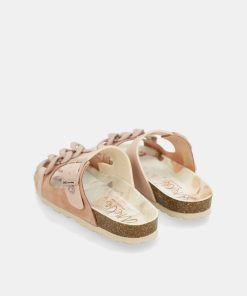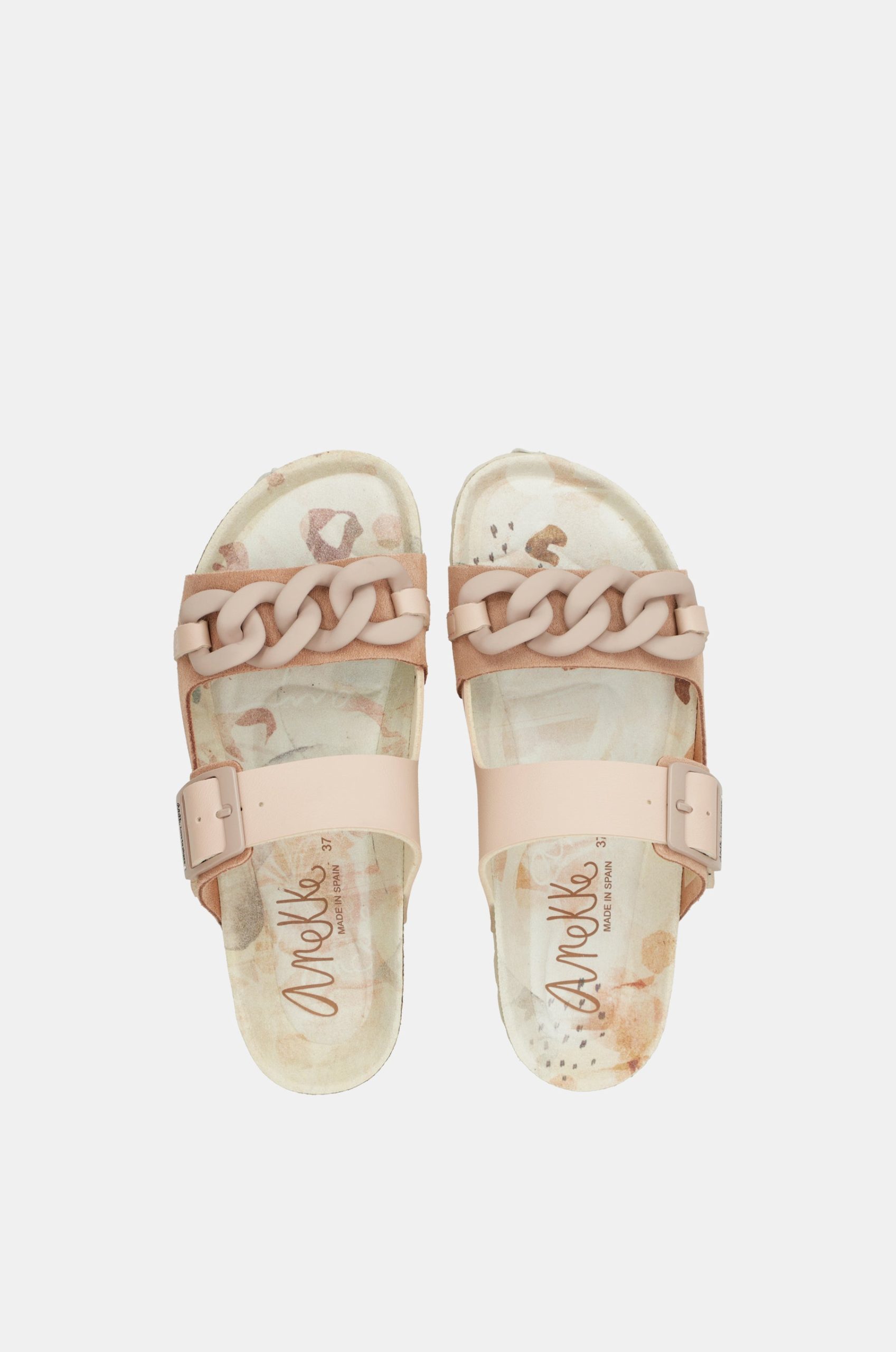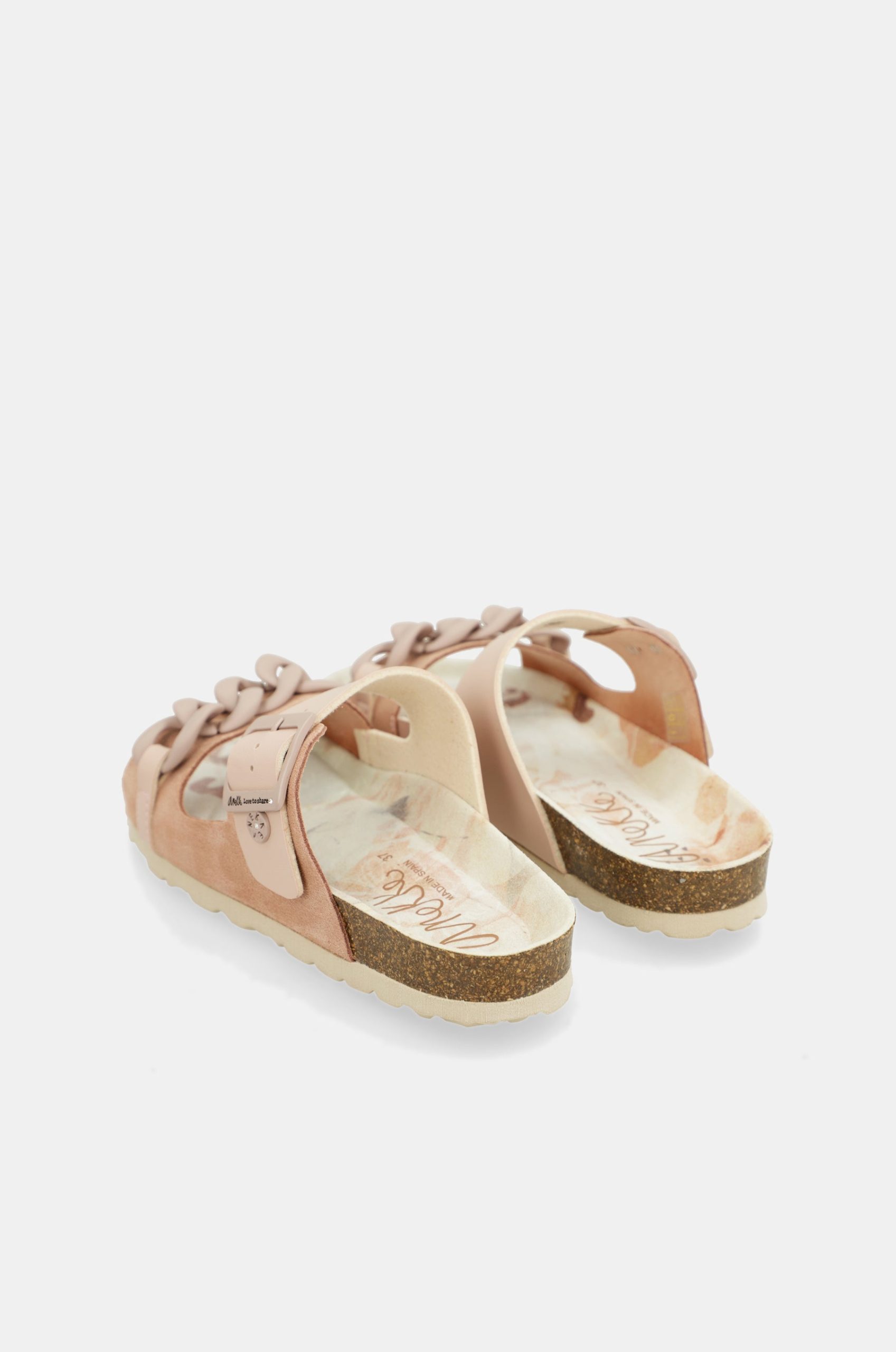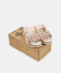 They feature a natural cork base combined with pink-toned material, along with an original printed sole. The customized buckle adjusts easily to different sizes.