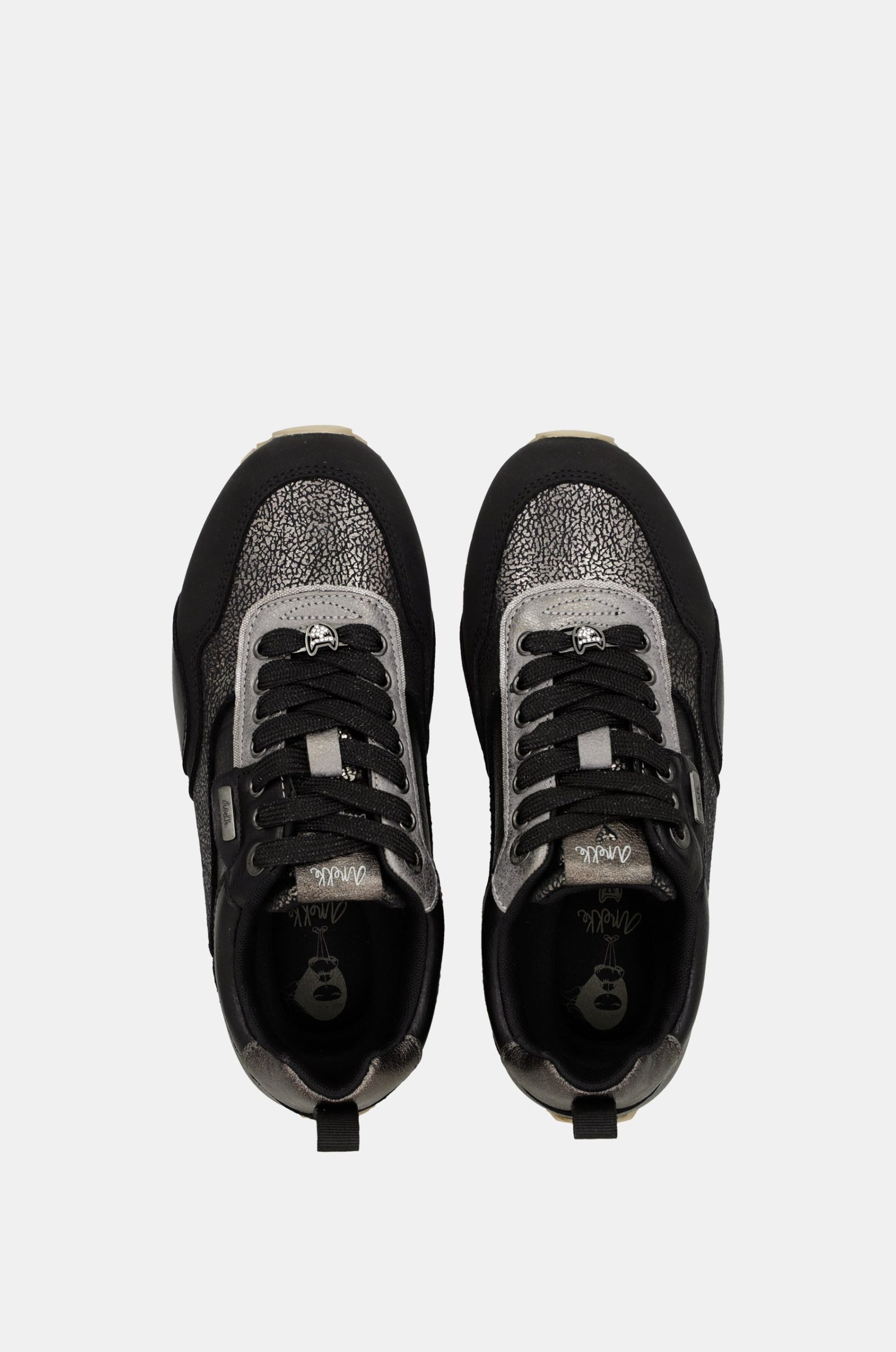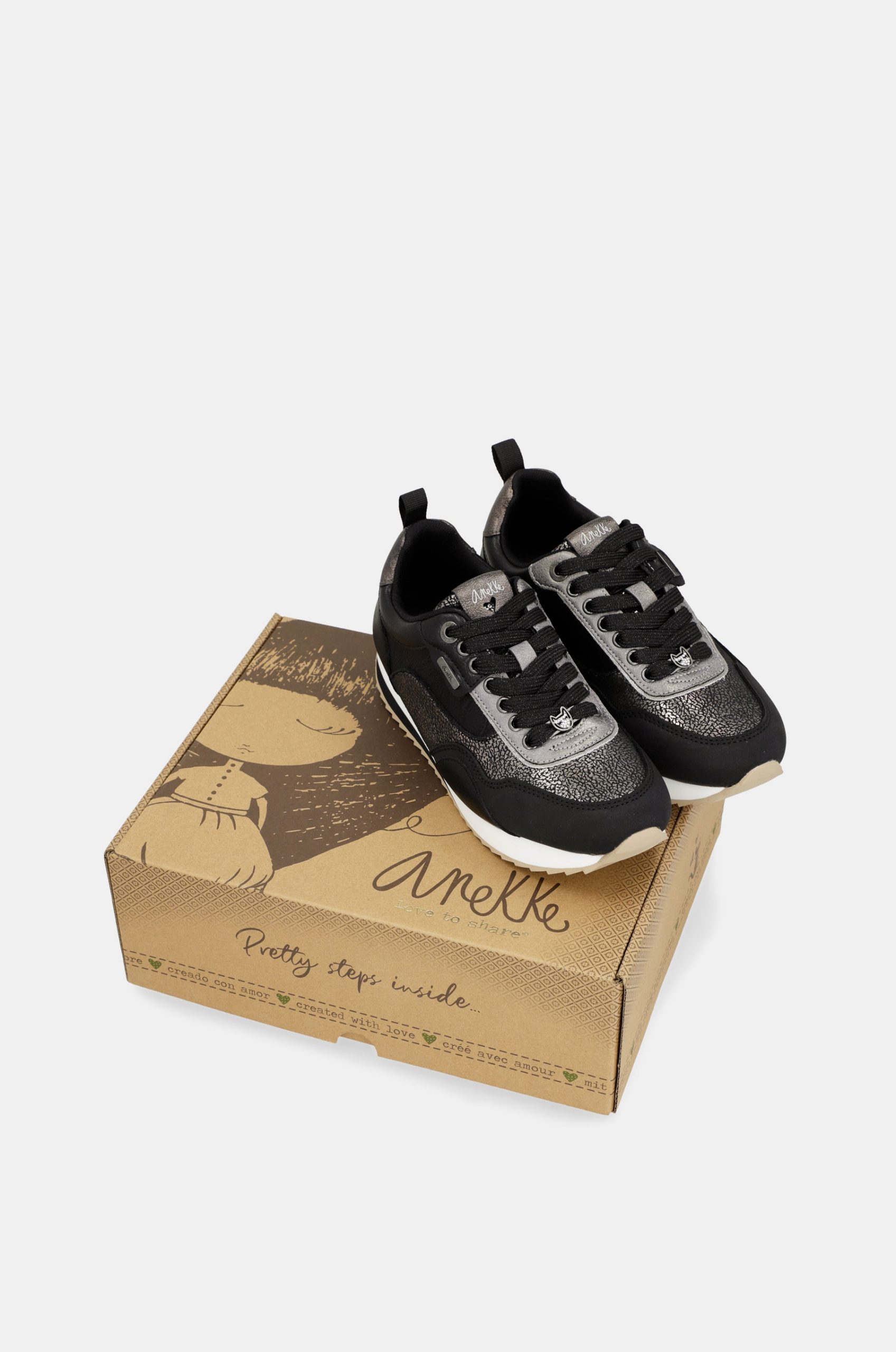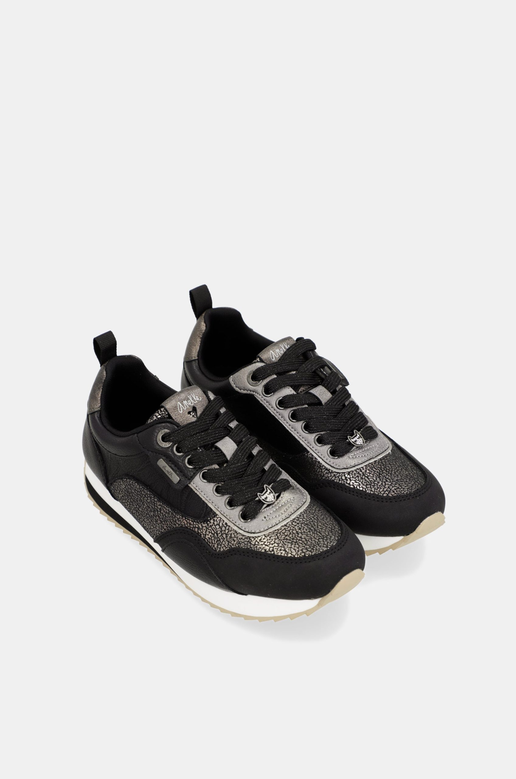 Comfort and style are the adjectives that define the design of these Anekke black sneakers. Your new favourites!The design of these sneakers combines a black base with metallic grey parts, with an aged effect. It is a sneaker with endless details, from the tongue to the laces, which will not go unnoticed. The serrated sole ensures comfort at every step, with a slightly raised toe for easy walking and adjustable laces for a better fit. It also has a removable and comfortable insole for extra comfort.Get them now and match them with all your favourite outfits. You are not taking them off!