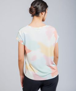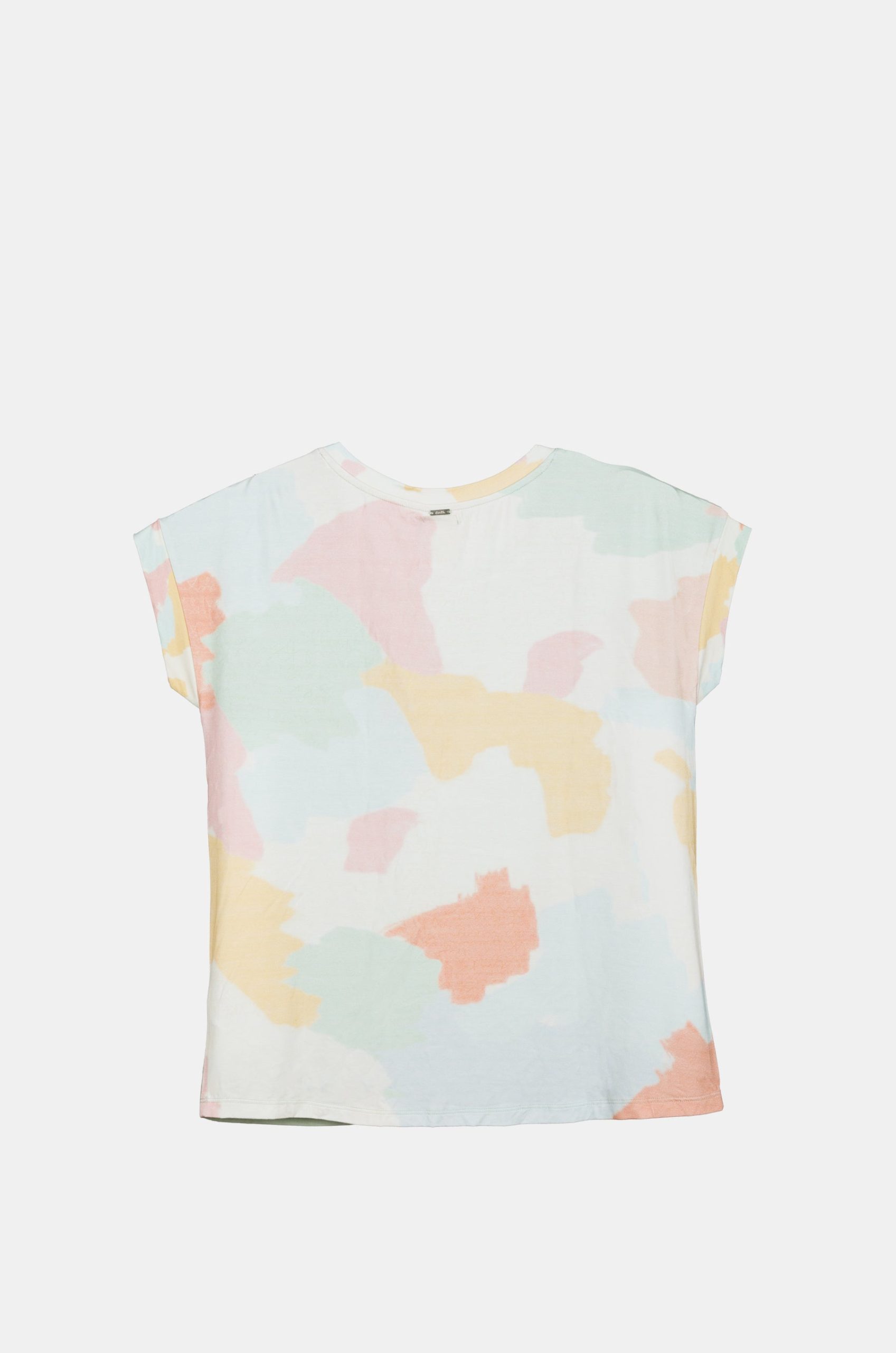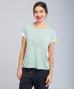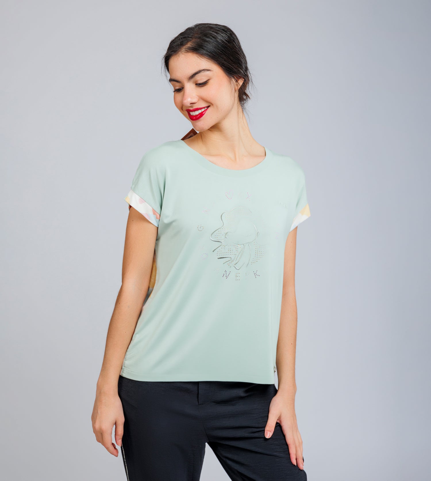 This unique green short-sleeve T-shirt features a comfortable fit and a round neckline. The cheerful combination of colors in the print on the back matches perfectly with the bag from the same collection, allowing you to create both casual and elegant looks, depending on the occasion.