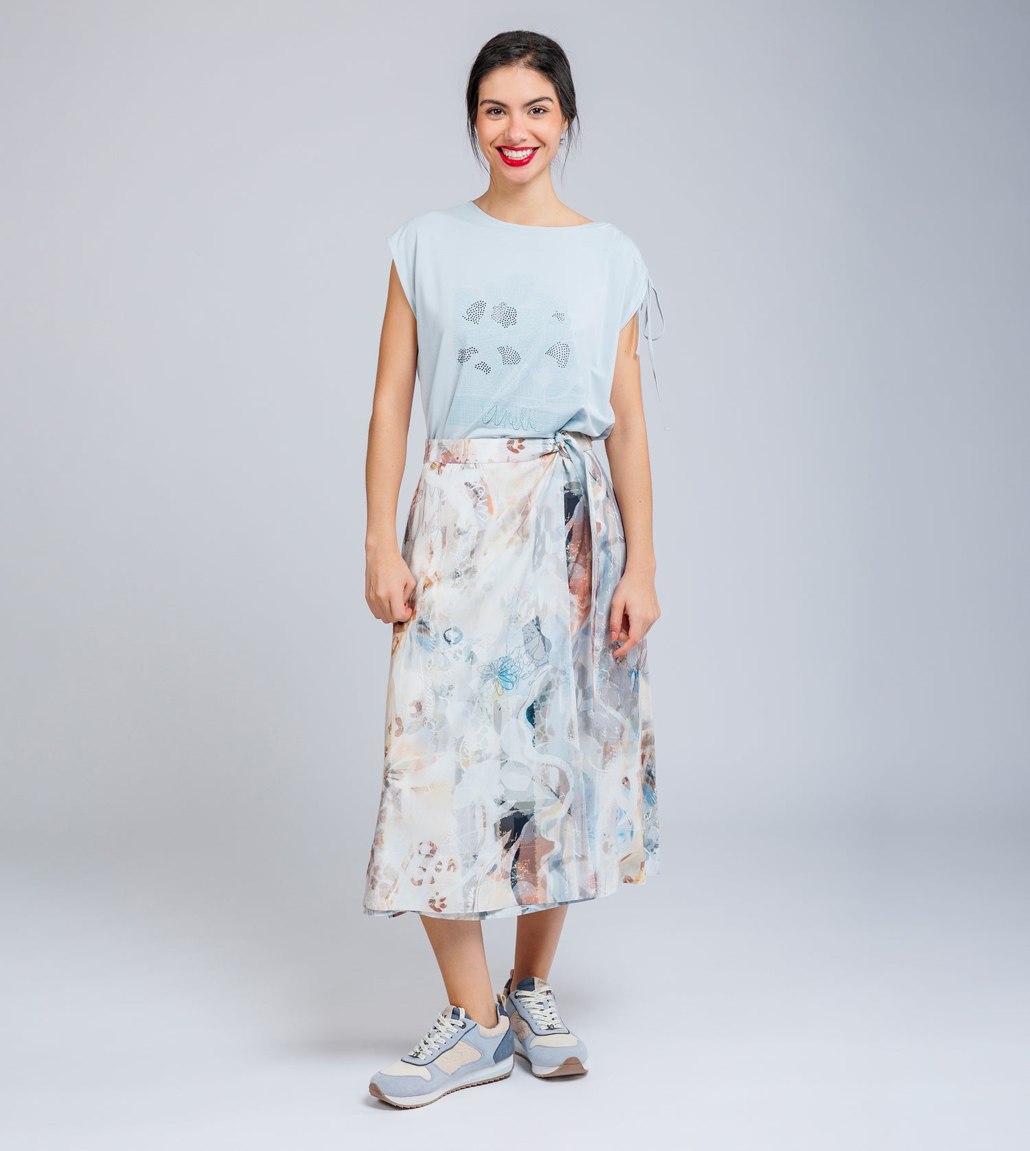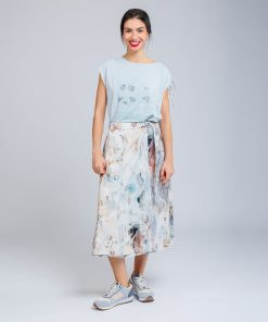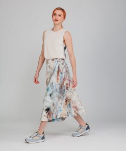 This midi wrap skirt is from the Memories collection and features a colorful print from the same collection.