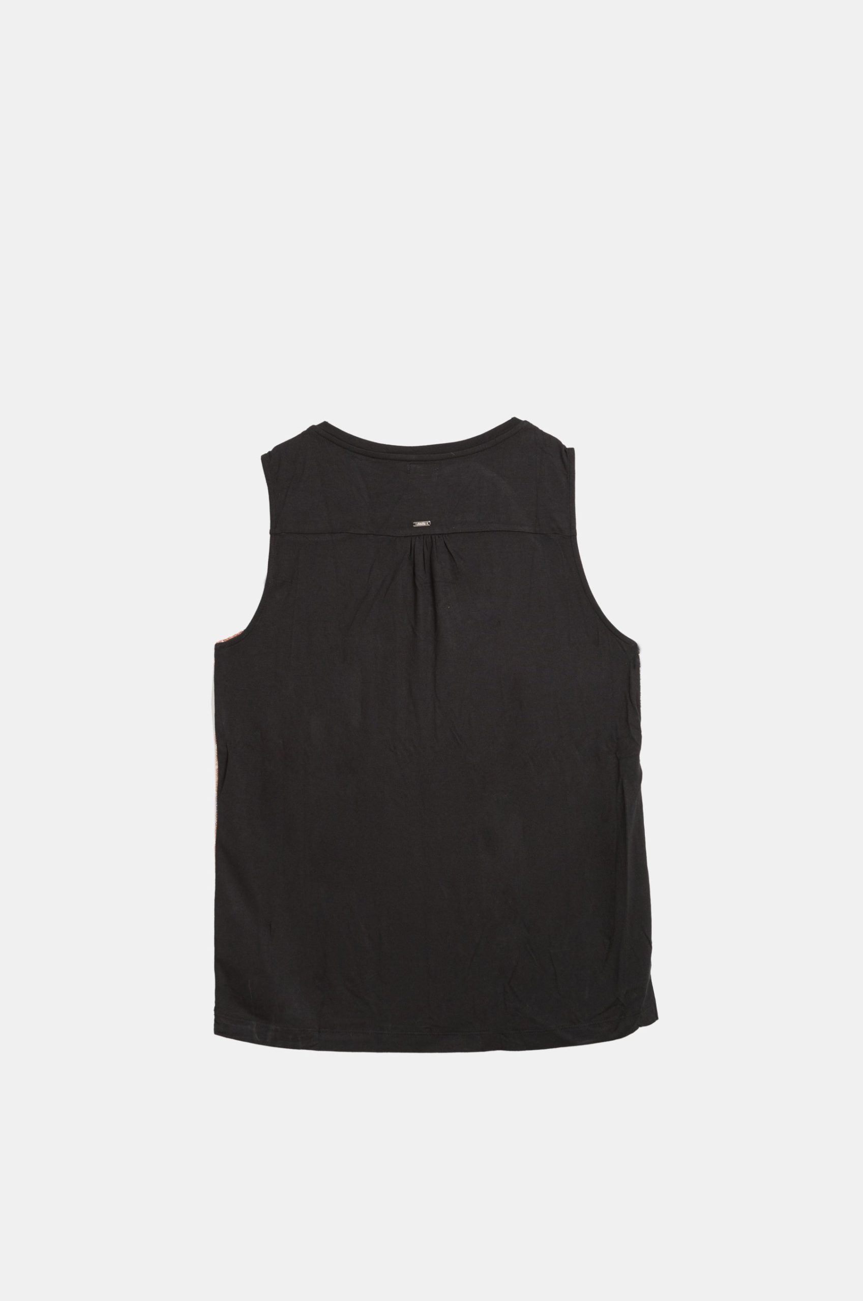 This sleeveless top with a V-neck combines an original multicolor print with transparent sequins layered on top. This gives it a super elegant shiny touch that will allow you to wear it on different occasions. The back is smooth in black color.