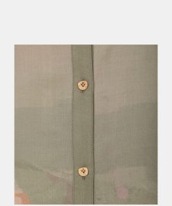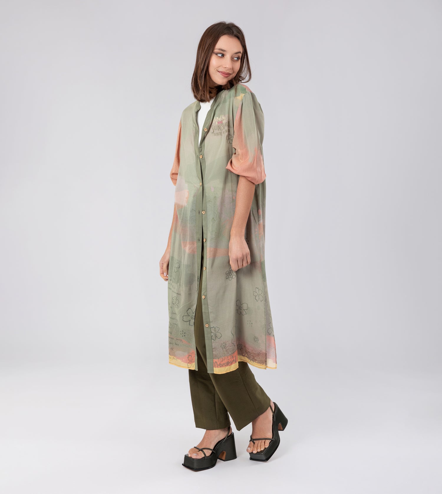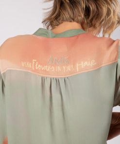 Its print is in green, orange and yellow colours. It has long sleeves and a button fastening. It also has a flowing feel and is a one-size-fits-all V-neckline, with an original wide fit.