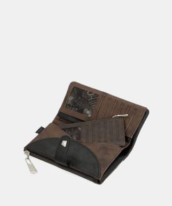 This large-sized wallet is made of flexible material. It has two main compartments: the back, where you will find a large billfold and space for banknotes and/or cards. It has a zip at the top, and inside you can keep coins. The entire interior is lined. It also has a removable card holder inside.